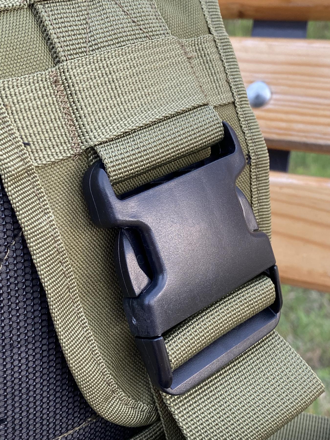 5) Шлейка для носіння рюкзака на плечі. Широкий ремінь з регульованою довжиною, який застібається на наплічник за допомогою міцного фастексу, що дозволяє швидко розстібати його. Нижнє кріплення забезпечується обертовим карабіном, закріпленим на одному з D-кілець, що дозволяє носити рюкзак на будь-якому плечі.