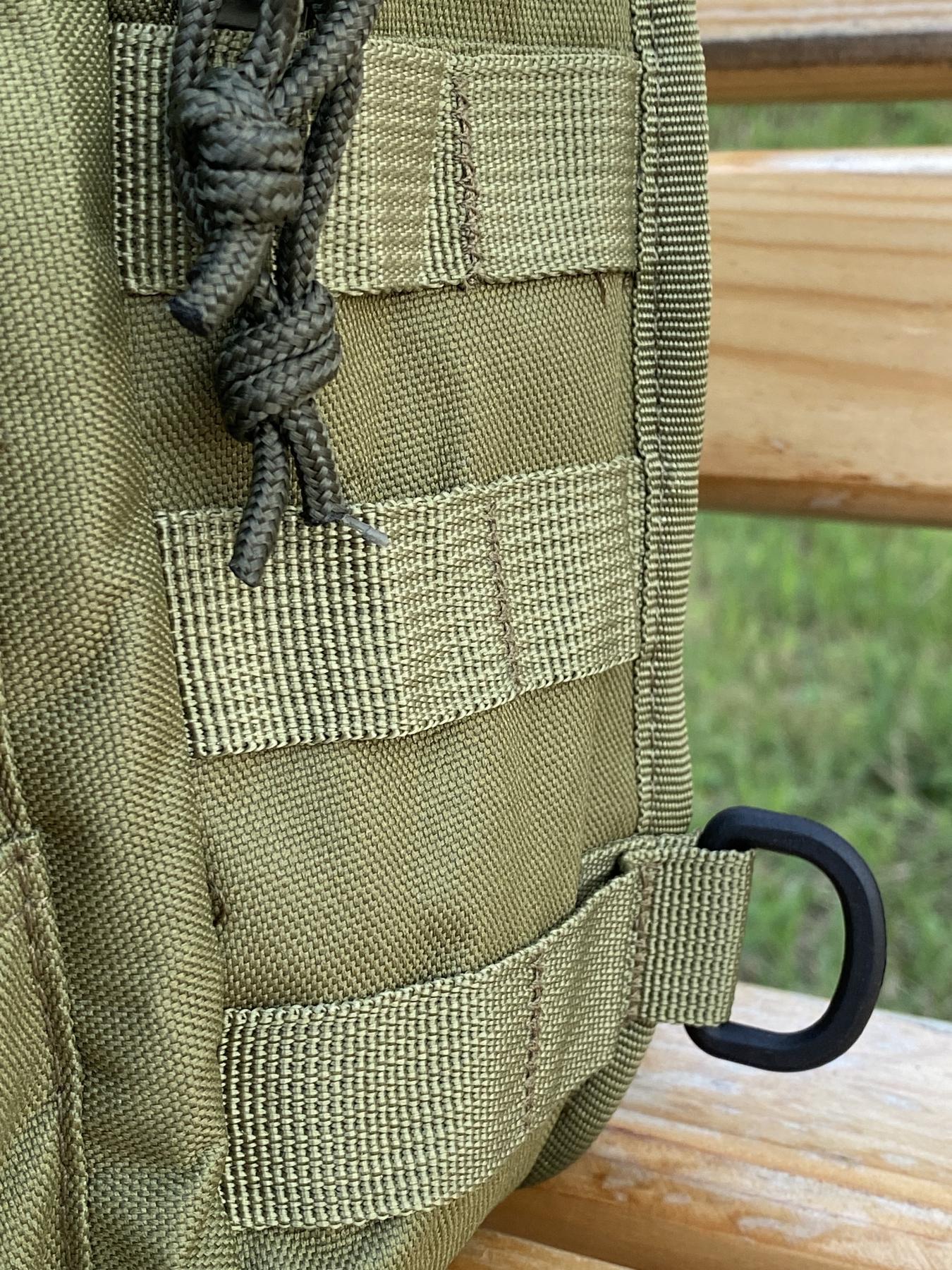 Рюкзак має систему Molle / Pals - зовнішні лямки шириною 2,5 см, що дозволяють кріпити сумки в модульній системі.