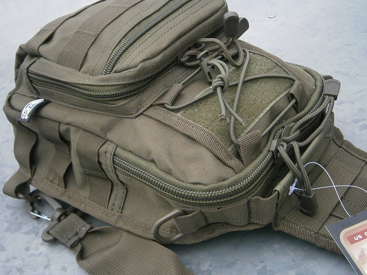 Основное отделение застёгивается на молнию с двумя бегунками, внутри два кармана. На лицевой стороне накладные карманы на молнии с внутренними отделениями и карабином, а также шнур-стяжка. С внутренней стороны большой усиленный карман на кнопке и маленький карман в верхней части. Съёмный плечевой ремень регулируется по длине и крепится карабинами. Имеется ручка для переноски. Молнии снабжены удобными петлями для пальцев. Сумка оснащена D-образными кольцами, Молли-стропами и липучкой для крепления дополнительного снаряжения. Размер: 19 х 24 х 8 см Ткань: 100% полиэстер