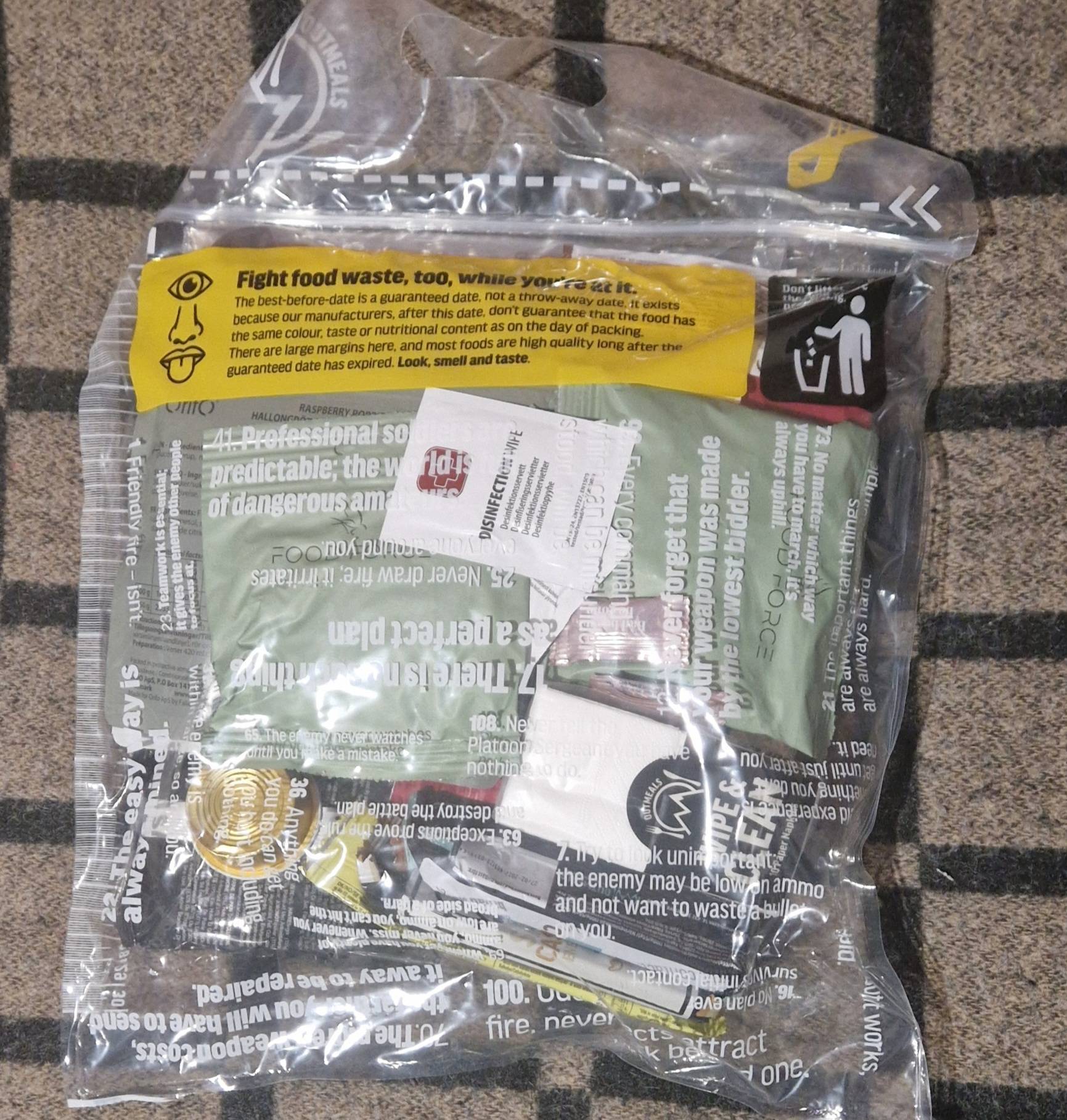 Ложка, цукерки, ізотоніки 3шт, батончики, жуйки, помазухи, кава, сухофрукти, лущені семічки, арахіс, салфетки, повидло, печиво, зубочистки. 4600 кілокалорій.