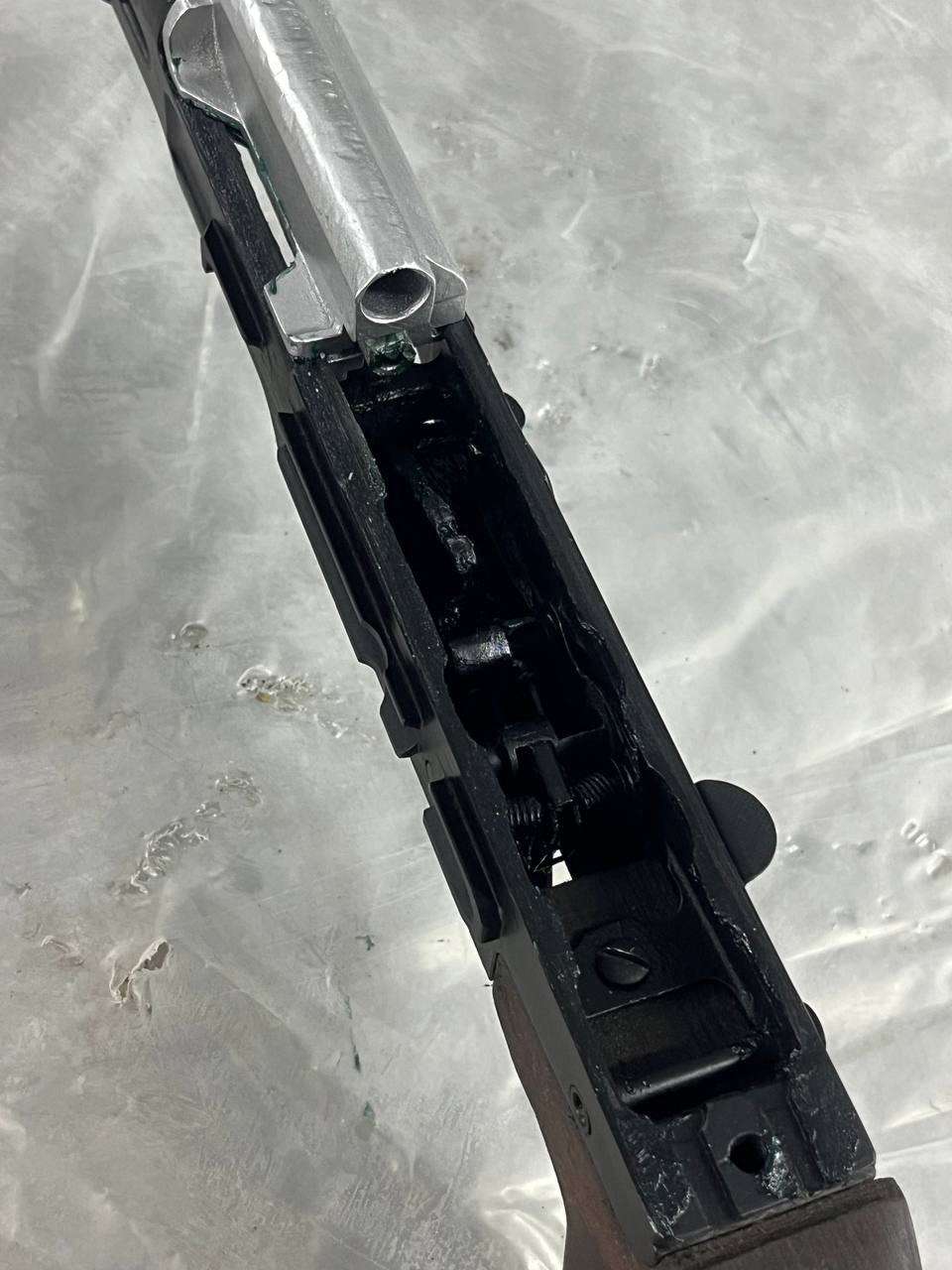 Заварений патронник, спиляний зуб в коробці, надпиляний курок в місці де бʼє по бойку, послаблені пружини усм, заварена лічинка, послаблений затвор, ствол прорізаний по всій довжині, ствол має під кінець ледь видну кривизну.