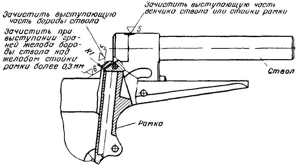 9. Просверлить сверлом диаметром 2,9 мм отверстие для шпильки ствола в бороде ствола через отверстие в стойке рамки, развернуть отверстие разверткой диаметром 3 мм и запрессовать шпильку ствола.