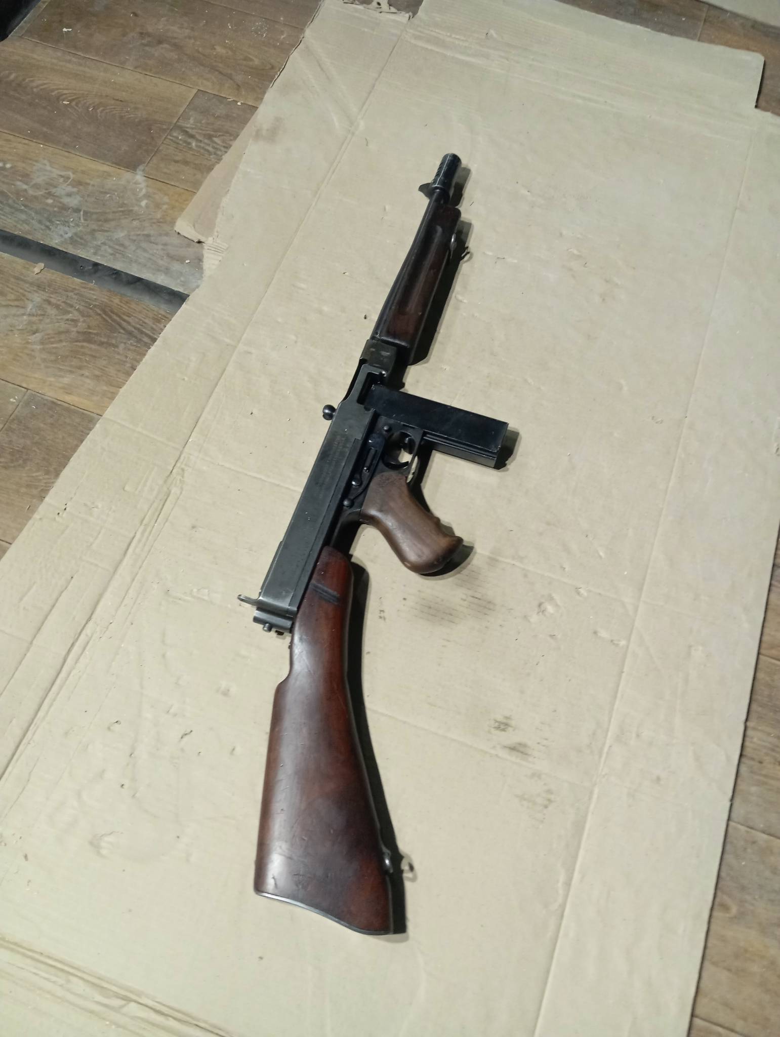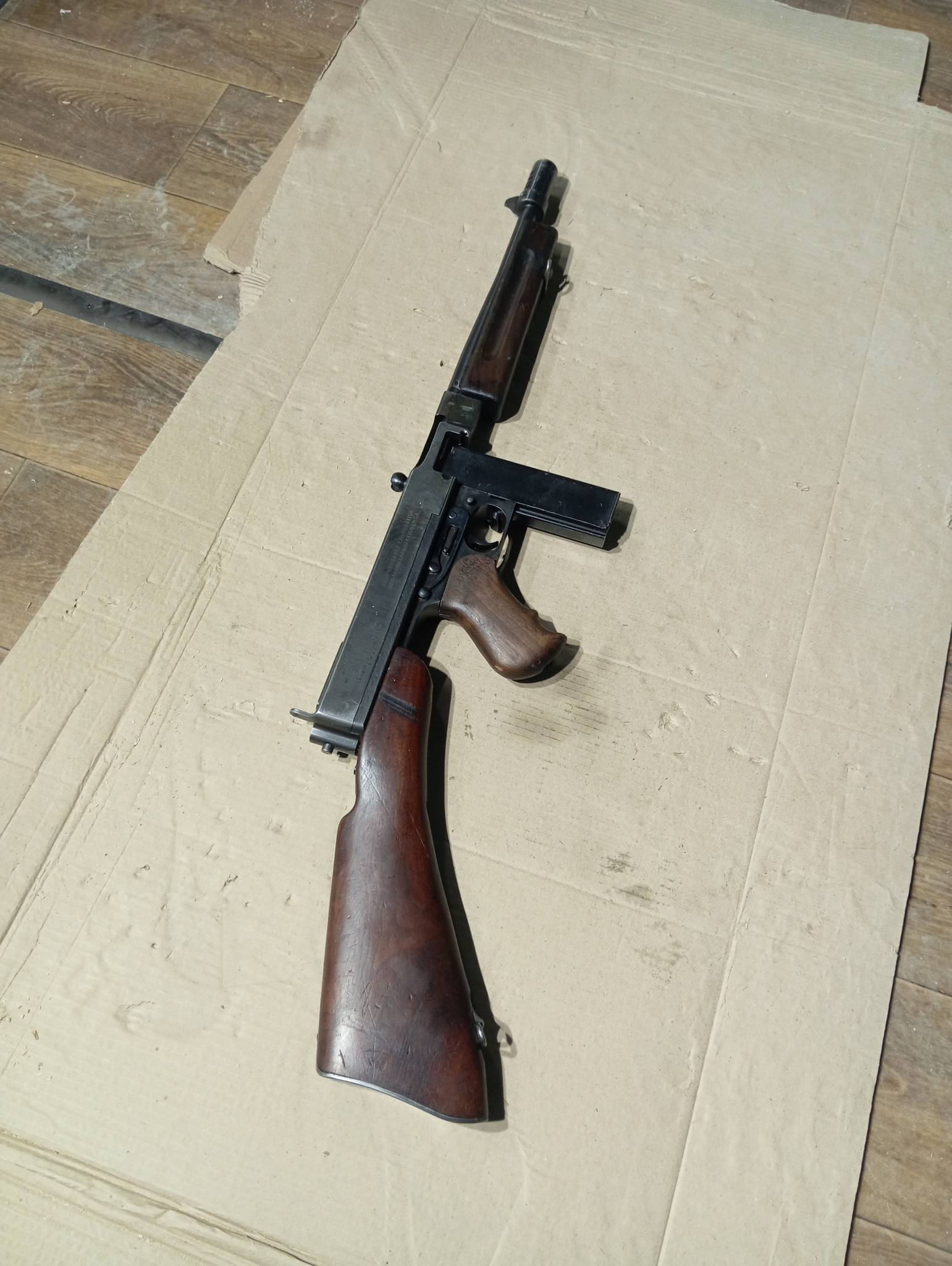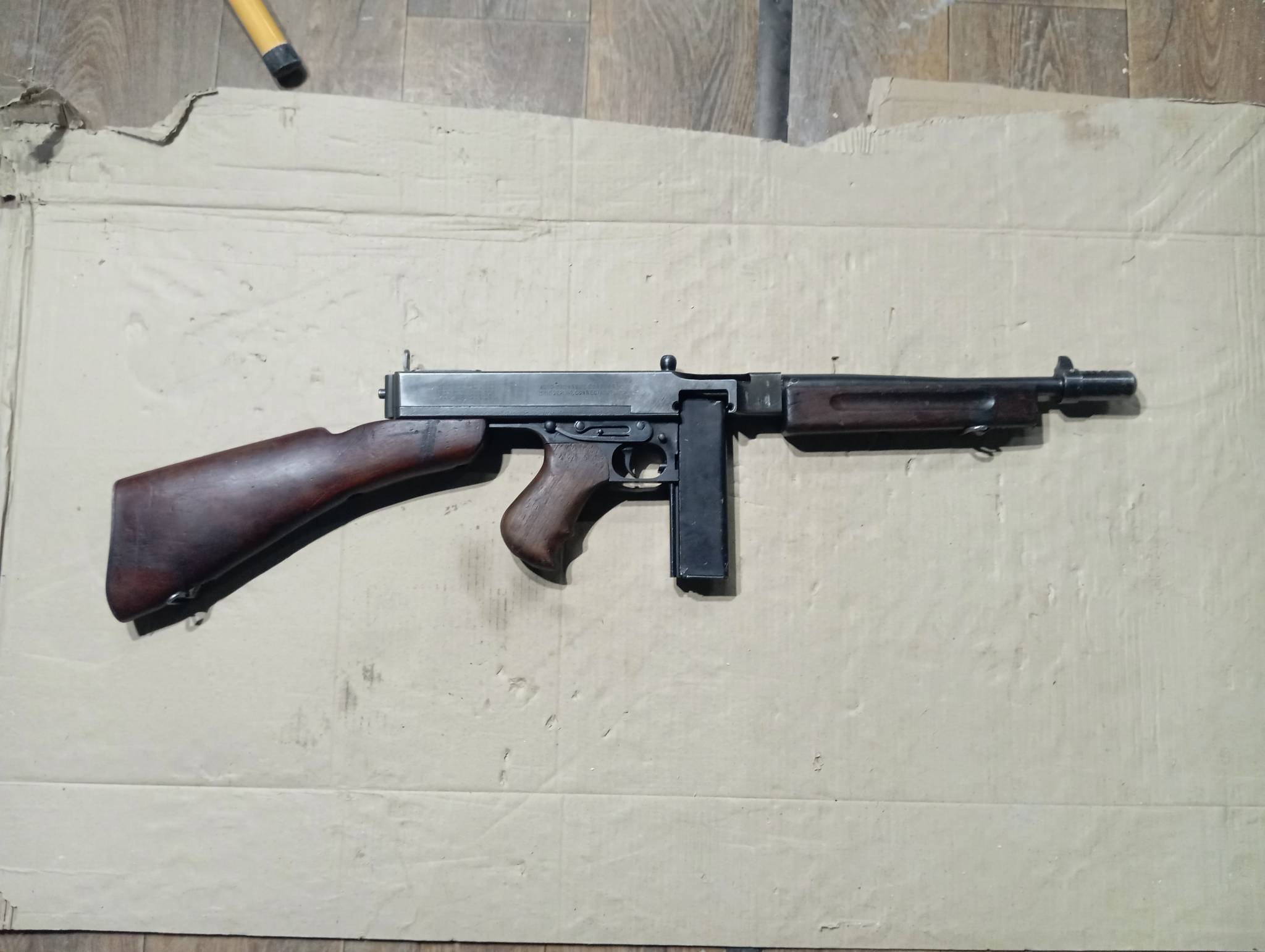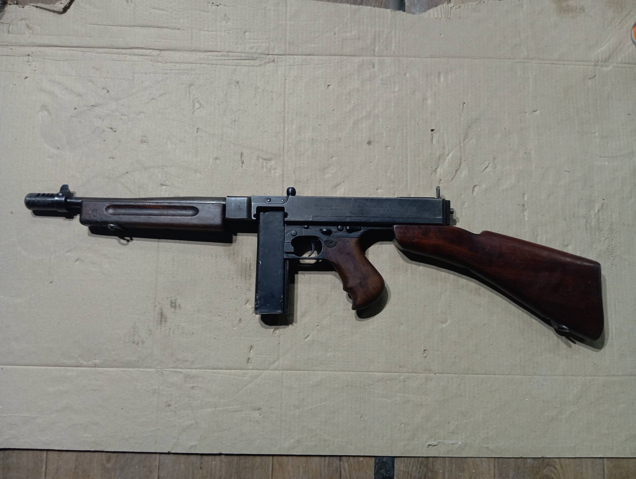 Пістолет-кулемет Thompson m1928 під сигнально-холості патрони МПУ. Відновлений з ммг. Пропил ствола заварений, сам ствол штифтований. Постріл бойовим набоєм неможливий. Магазин перероблений під МПУ, затвор також. Гарна річ в колекцію.