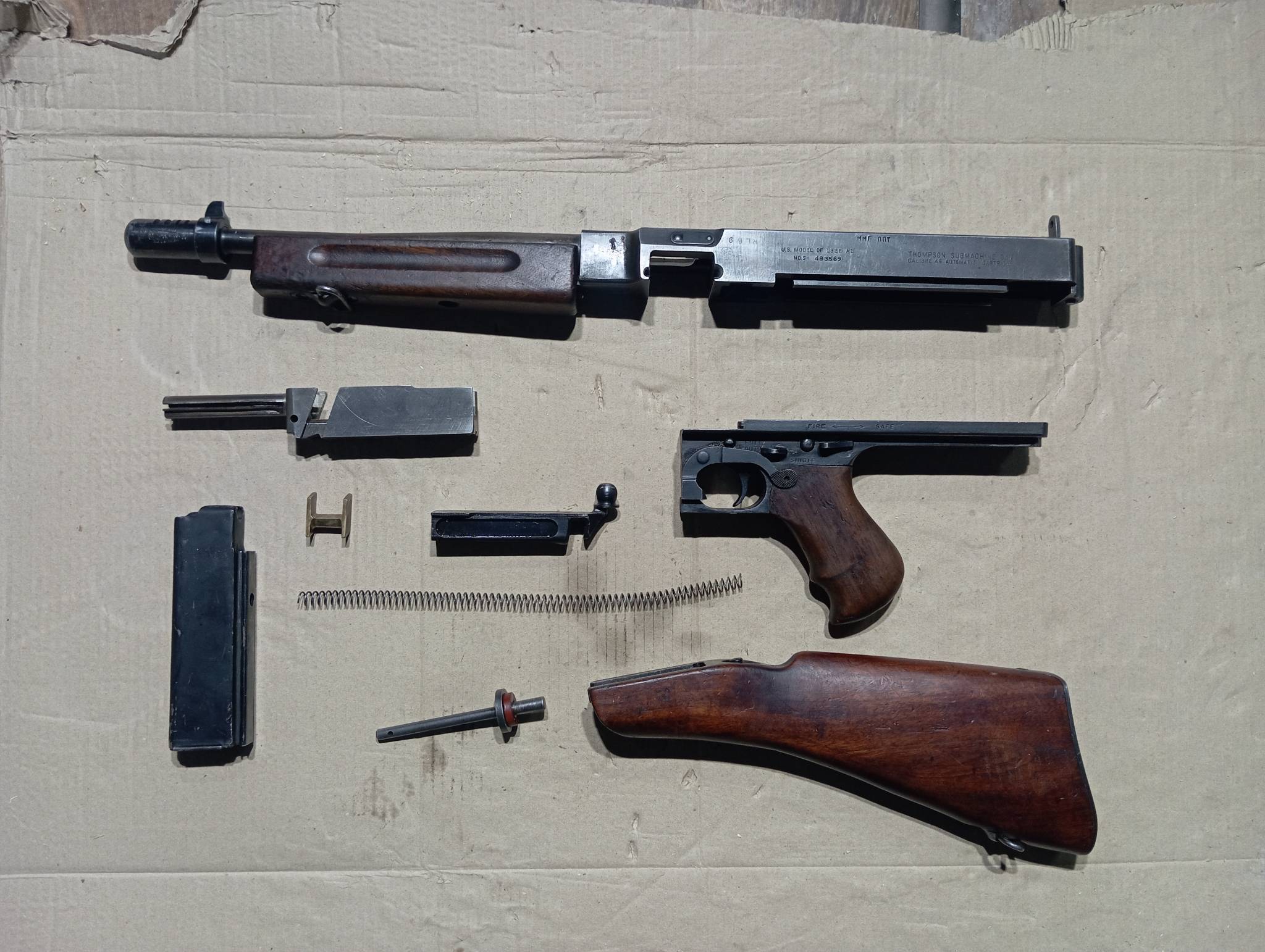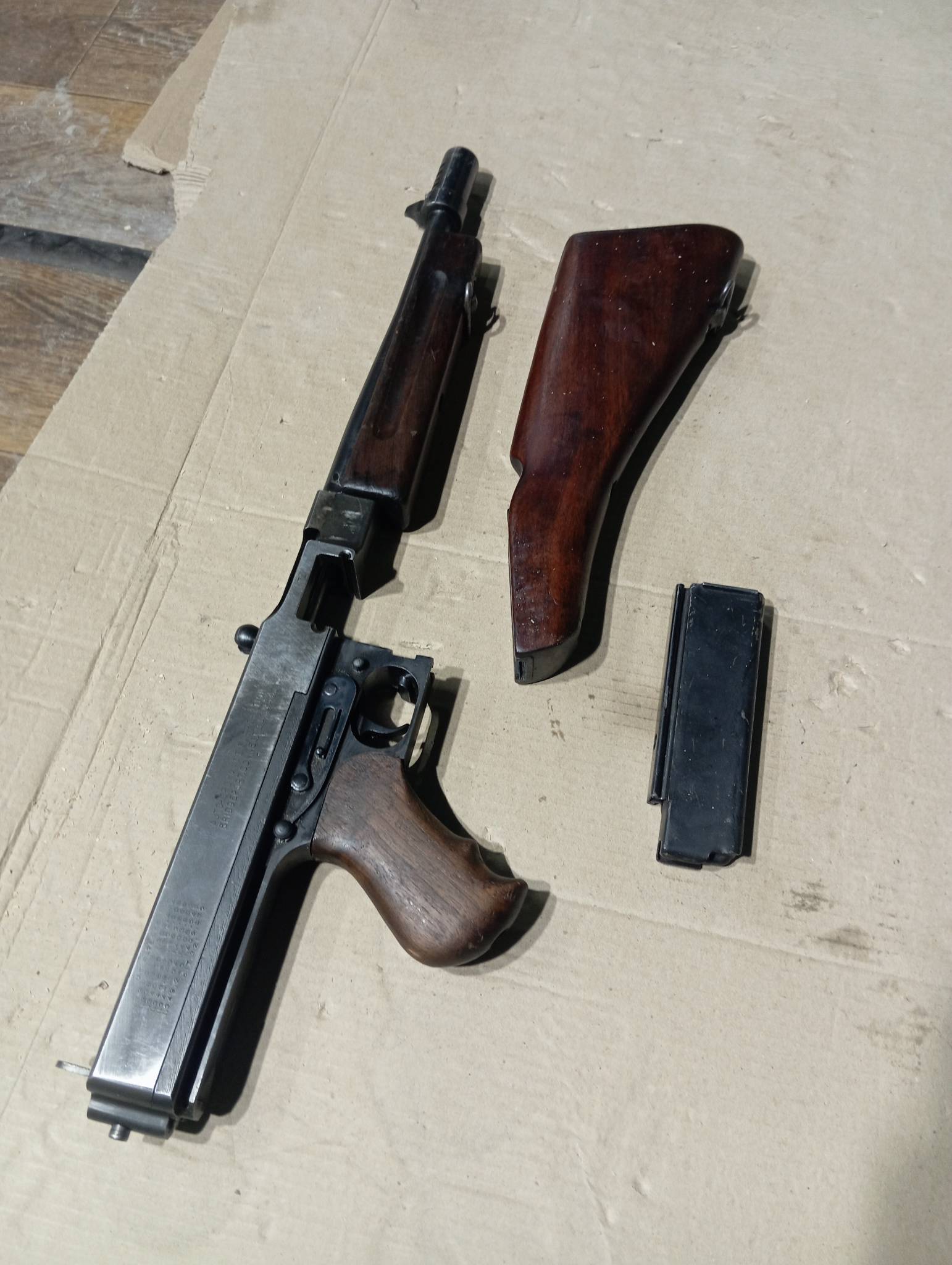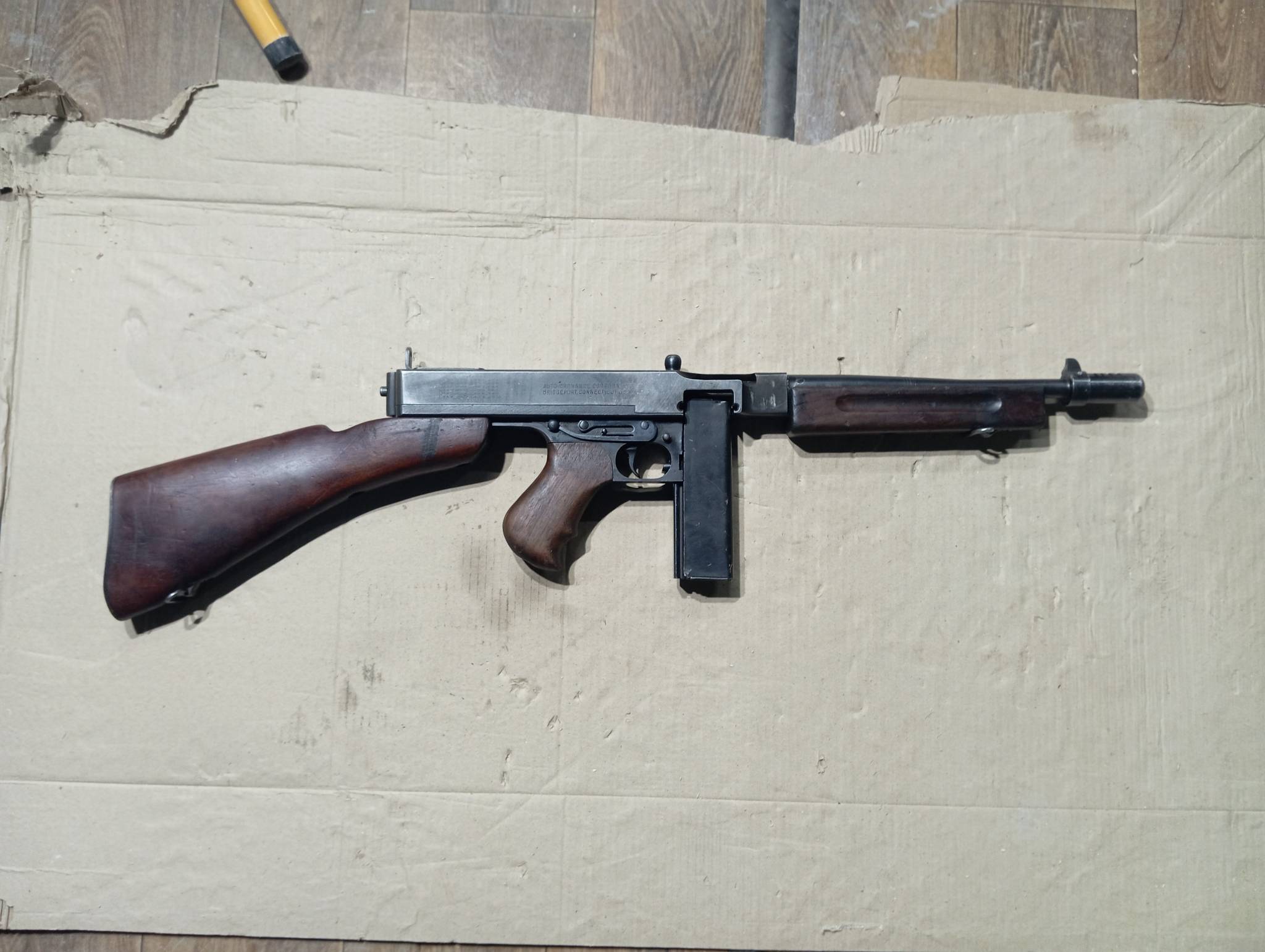 Пістолет-кулемет Thompson m1928 під сигнально-холості патрони МПУ. Відновлений з ммг. Пропил ствола заварений, сам ствол штифтований. Постріл бойовим набоєм неможливий. Магазин перероблений під МПУ, затвор також. Гарна річ в колекцію.