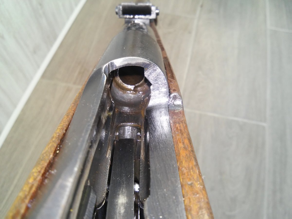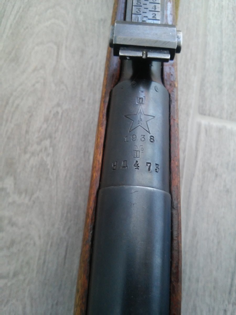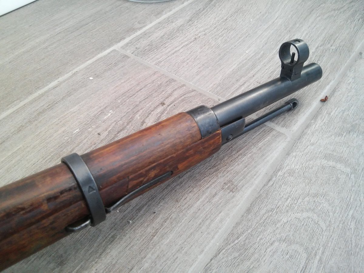 Деактив: в стволе вставлен лайнер(сужающий канал ствола и препятствующий применению боевых патронов)+на конце ствола капля сварки. Все детали складские, за исключение личины (отличный чердак), дерево "военное" с глазками, но есть ремвставки.