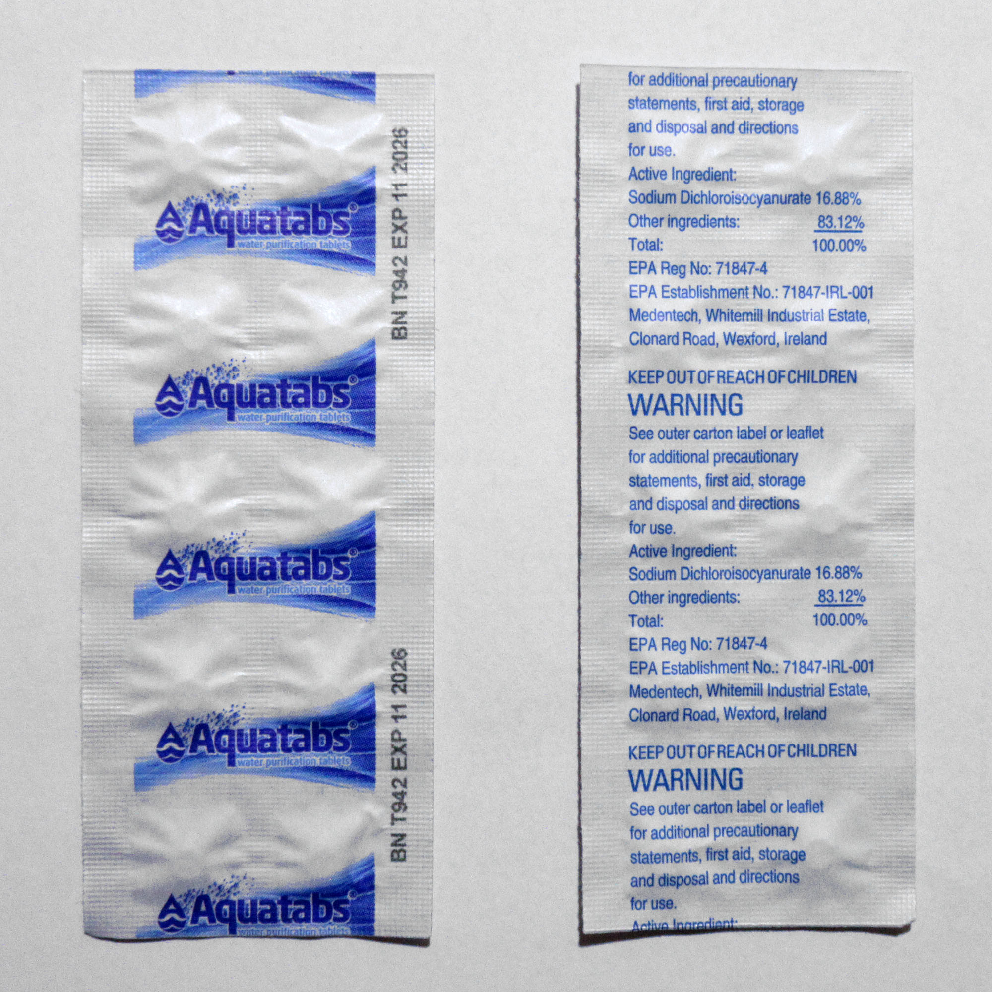 Одна таблетка знезаражує два літри води з індивідуальної питної системи при кімнатній температурі. В разі використання води з річок, боліт, озер, струмків, ємностей для води (з дощовою, зливною водою) та схожих місць потрібно прибрати поверхневі забруднення (шматочки дерева, паперу, пластику та інших речей), бруд, плівку, та інше. Якщо є мул, дочекайтеся поки він випаде в осад. За можливості перелийте підготовлену забруднену воду у чистий контейнер. Розчиніть таблетки Aquatabs із розрахунку 1 таблетка на 0.75 л забрудненої води. Ретельно перемішайте воду з таблетками впродовж 10 хв. Дайте відстоятися 30 хв.