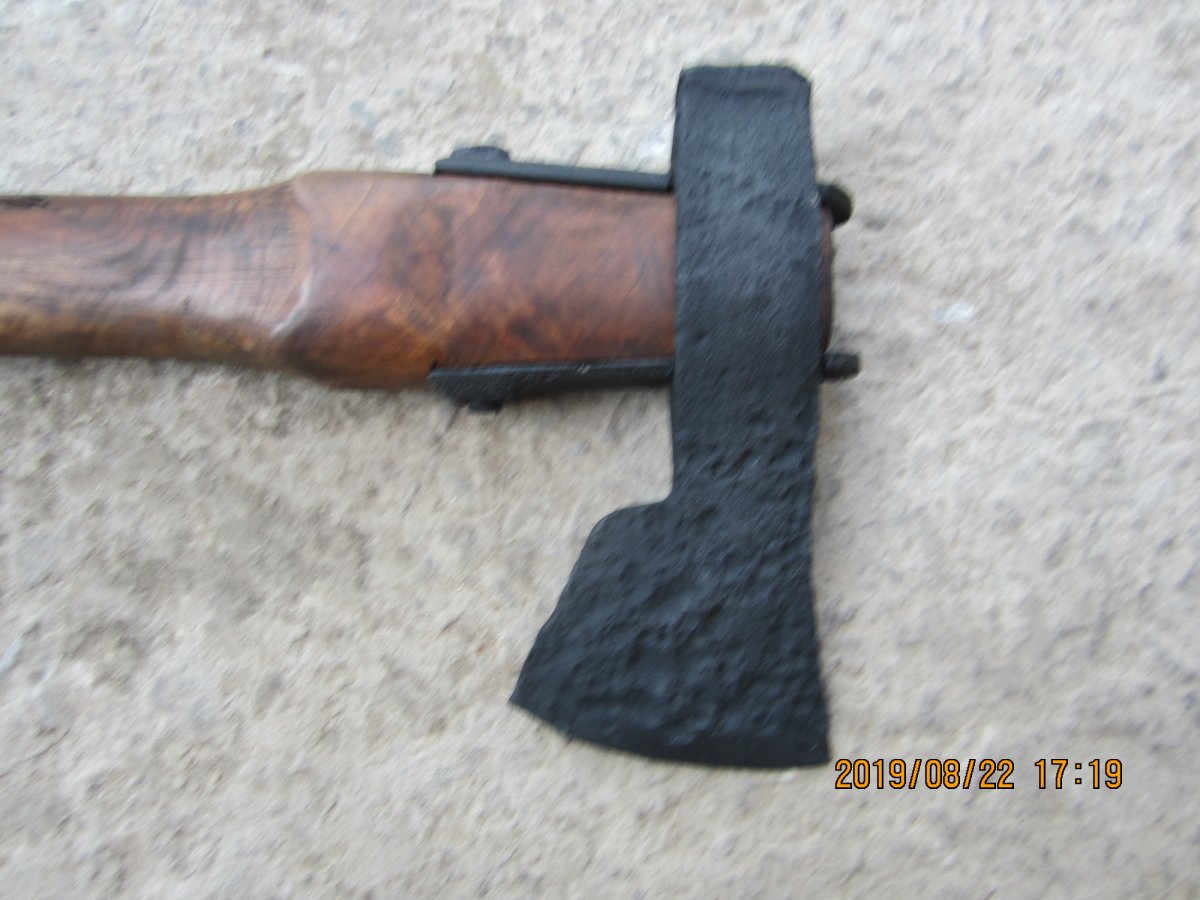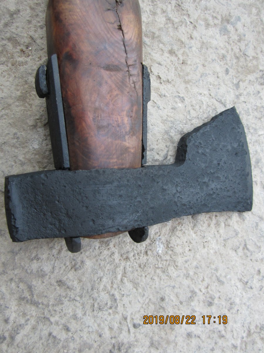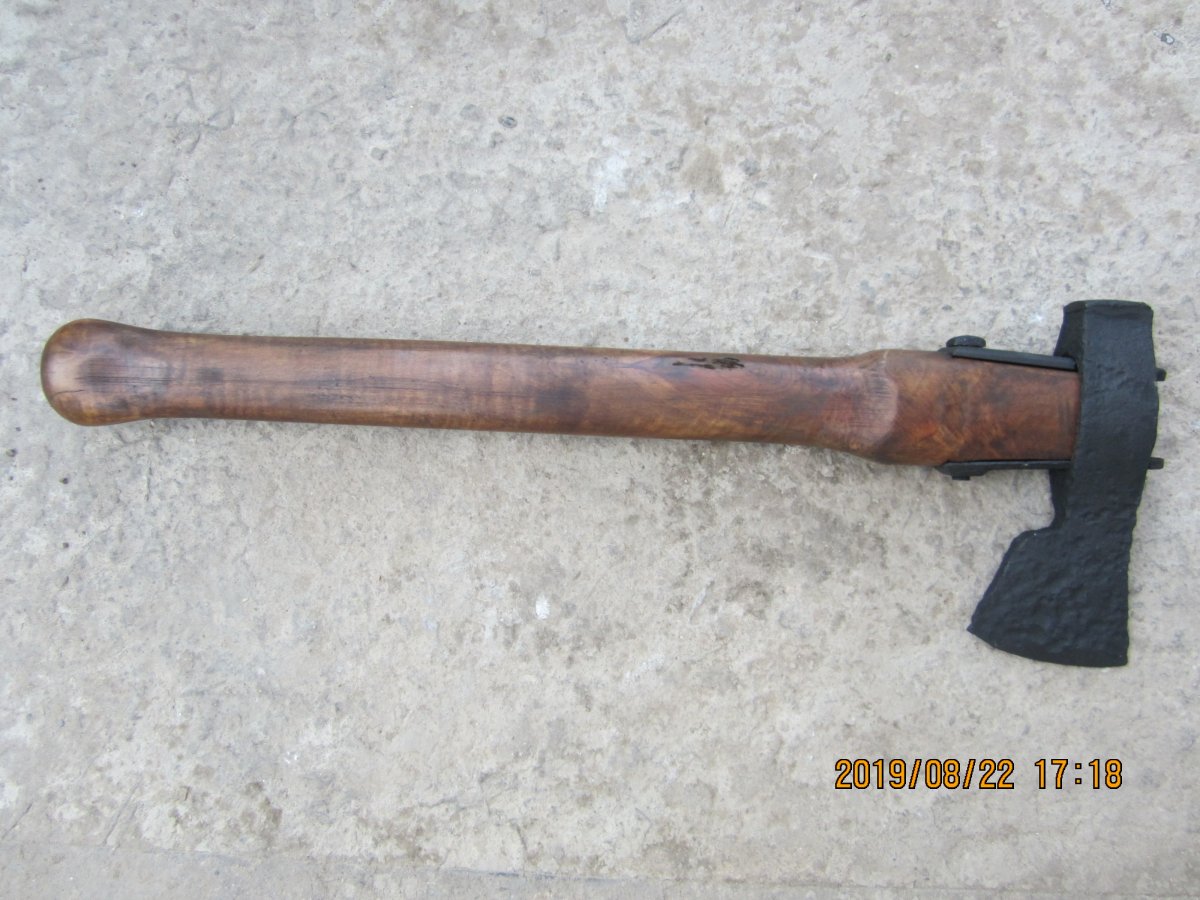 Оригинальный топорик. ( Не путать с обрезанным кирко- топором) Одна растопырка оригинал. Дерево новодел, реплика, застарено. Пропитано спиртовой морилкой и отполировано. На первом фото трещина сверху, но лопнуто.