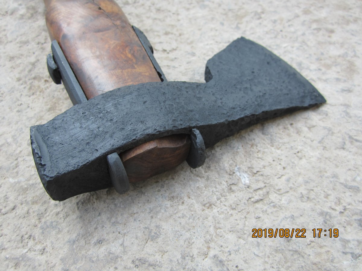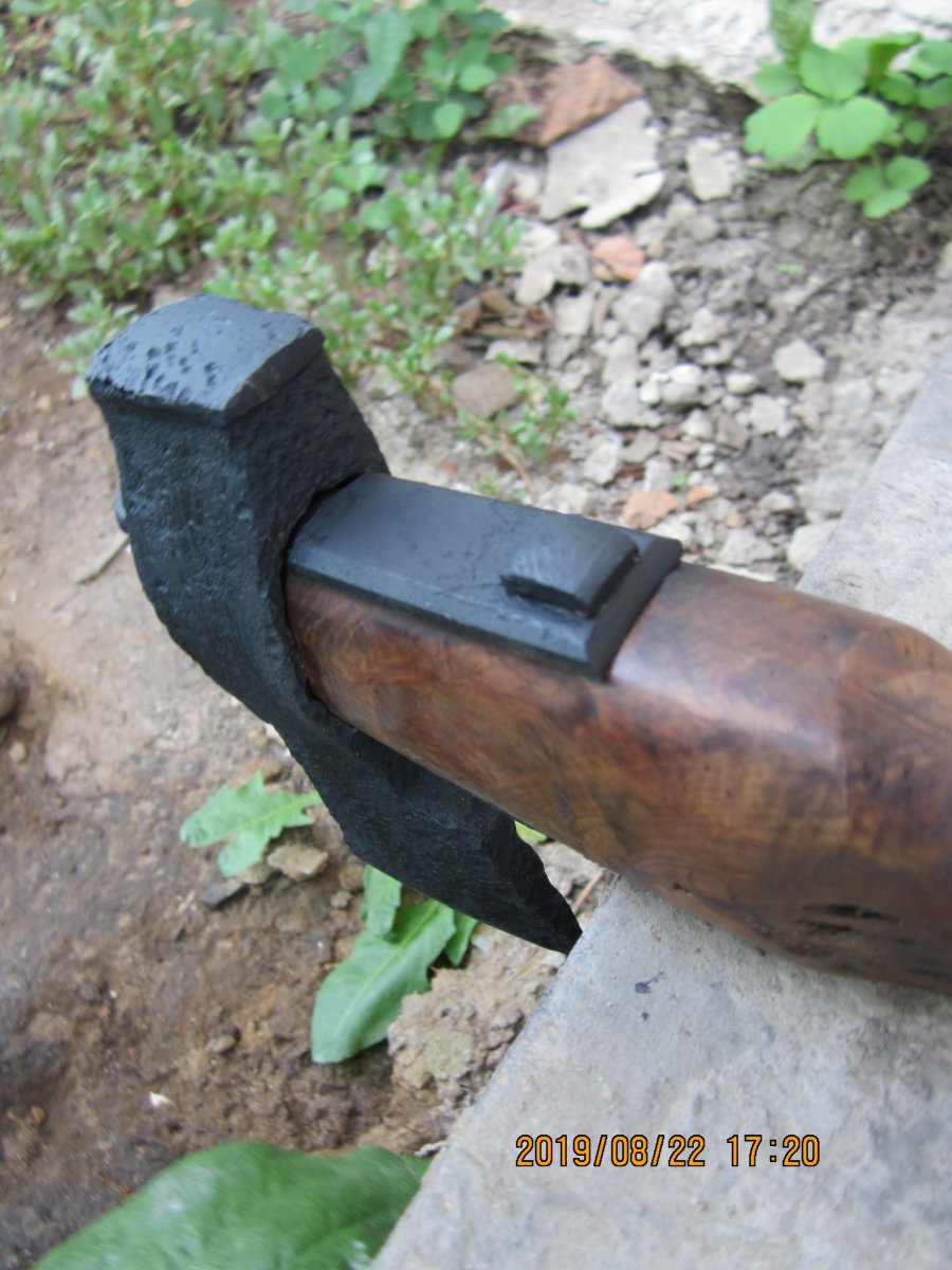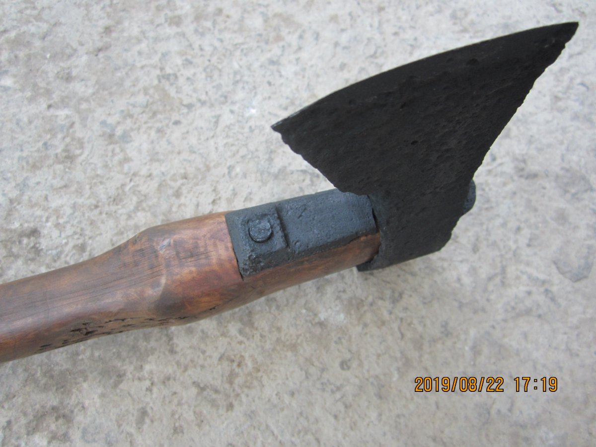 Оригинальный топорик. ( Не путать с обрезанным кирко- топором) Одна растопырка оригинал. Дерево новодел, реплика, застарено. Пропитано спиртовой морилкой и отполировано. На первом фото трещина сверху, но лопнуто.