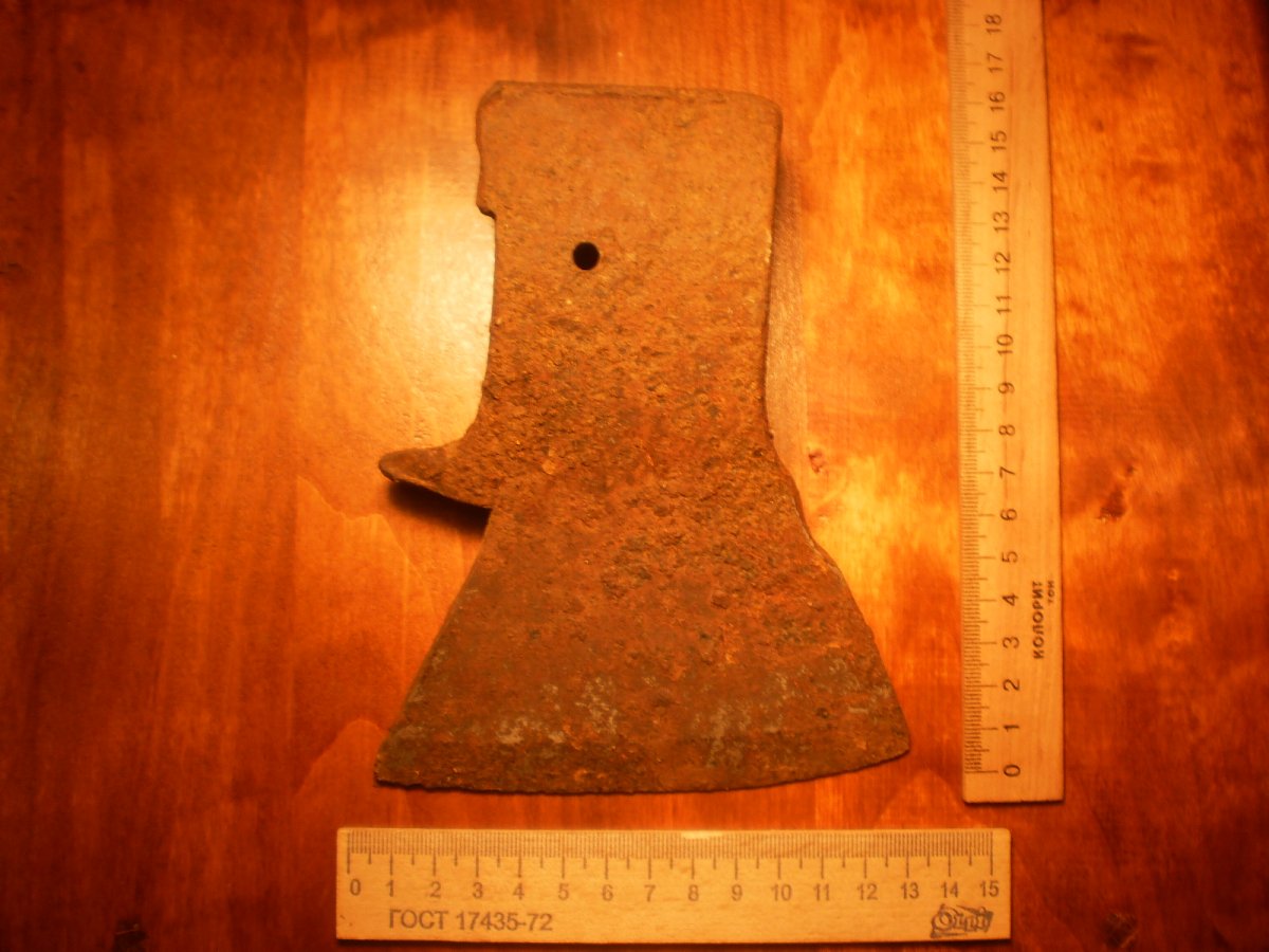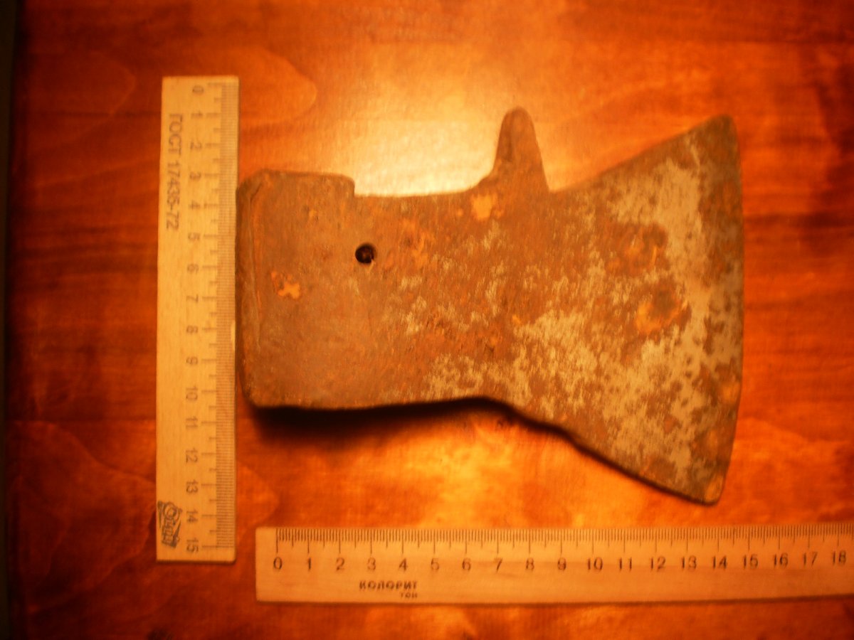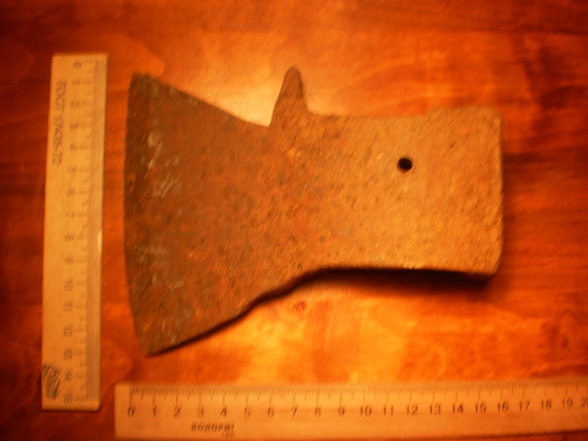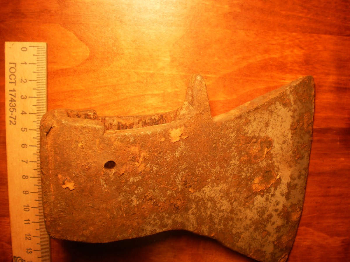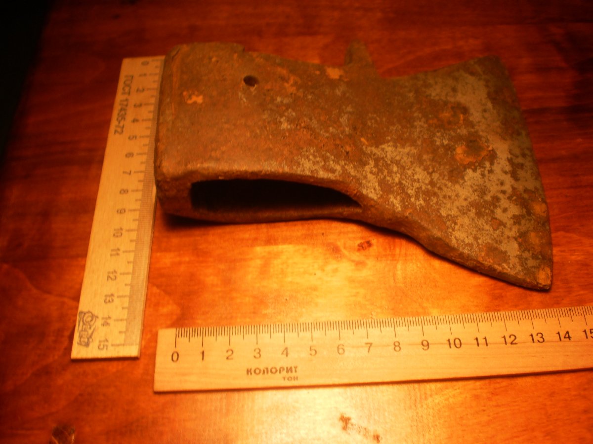 Топор-колун.Копаный.Помыт водой.Не чищен и не точен.Имеет в обухе сквозные два отверствия под штифт вместо клинышка.Но можно топорище ставить и на клин.