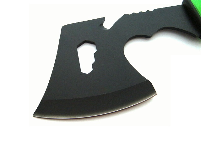 топор имеет современную форму. Он изготовлен из толстой стали №420, лезвие покрыто антибликовым покрытием. Ручка выполнена из резиноподобного материала и имеет зеленые вставки что делает топор всегда видимой. Топор имеет дополнительное лезвие для резки мононитей и шнуров. В комплект входит чехол для лезвия. топор подходит для метания. новый и острый.