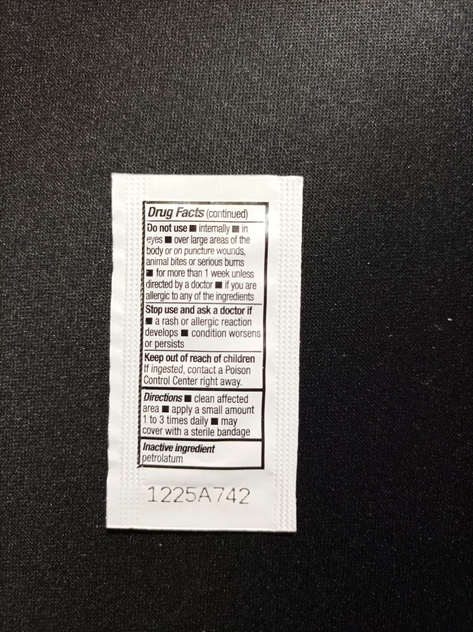 Фольговані пакетики по 0,5 грамм, розмірами приблизно 6*3 см. 1 пакетику тройного антибіотика (в залежності від розміру рани) може вистачити на 1-3 застосування.
