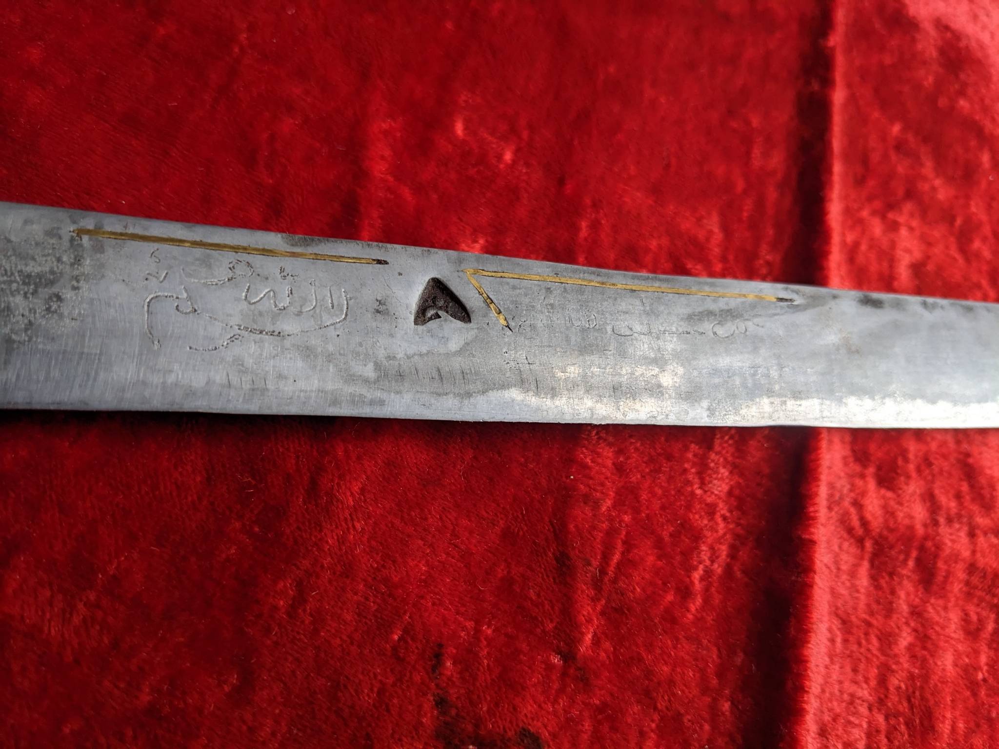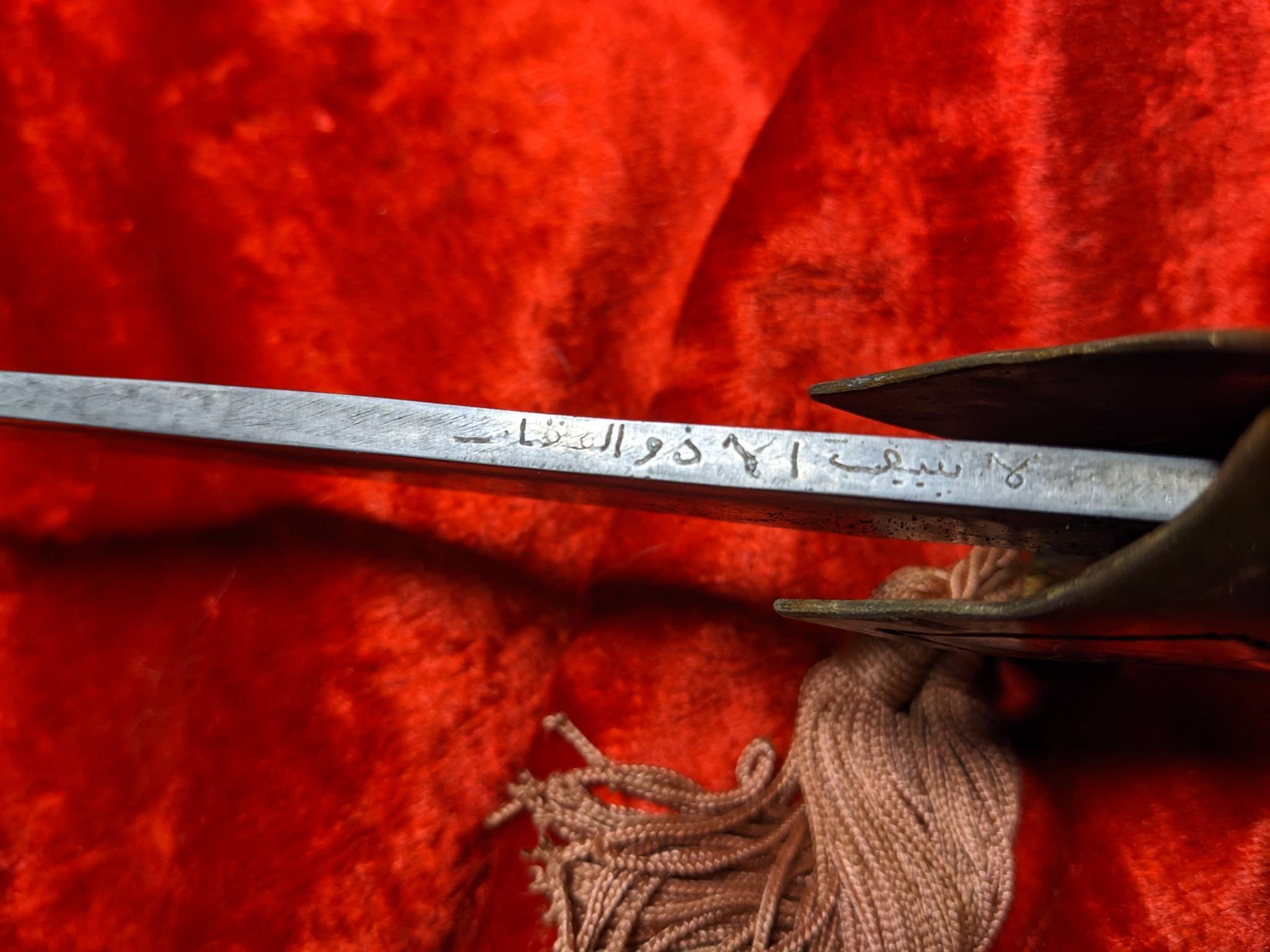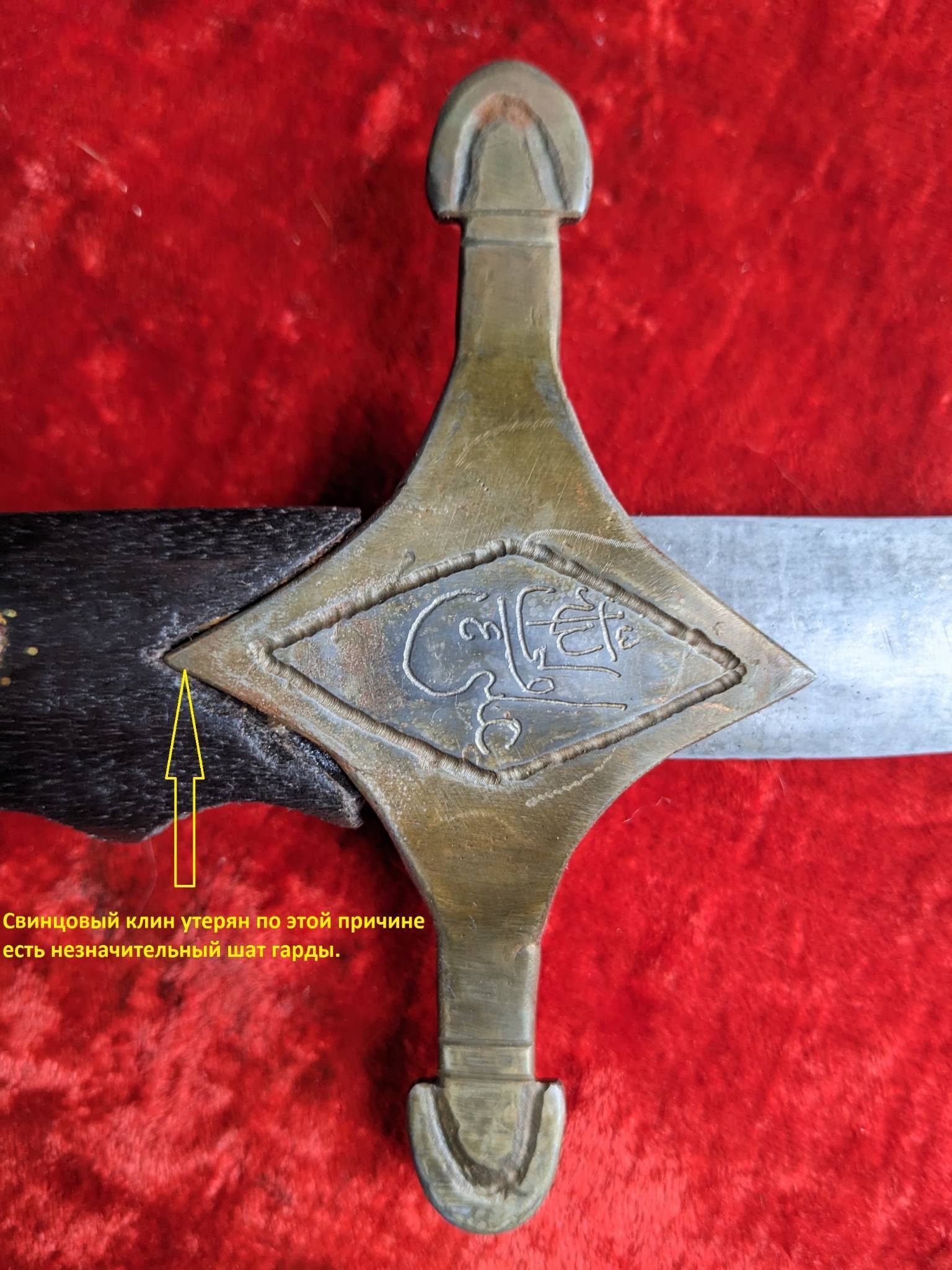 Гарда латунь, (подозреваю в реставрации) ромб травлен, именно надпись ручной штихель. Ромб на гарде , внутри залужен серебром, по нем гравировалась надпись, с обратной стороны лужение практически полностью истерлось. Между гардой и деревом, был залит свинец. С одной стороны есть, с другой по видимому дерево всохло потерялся.