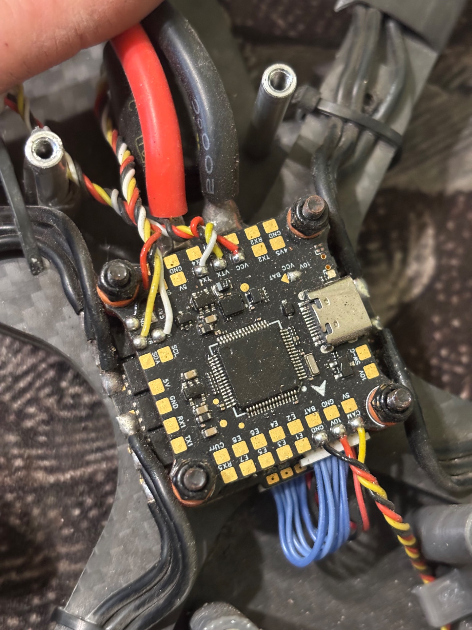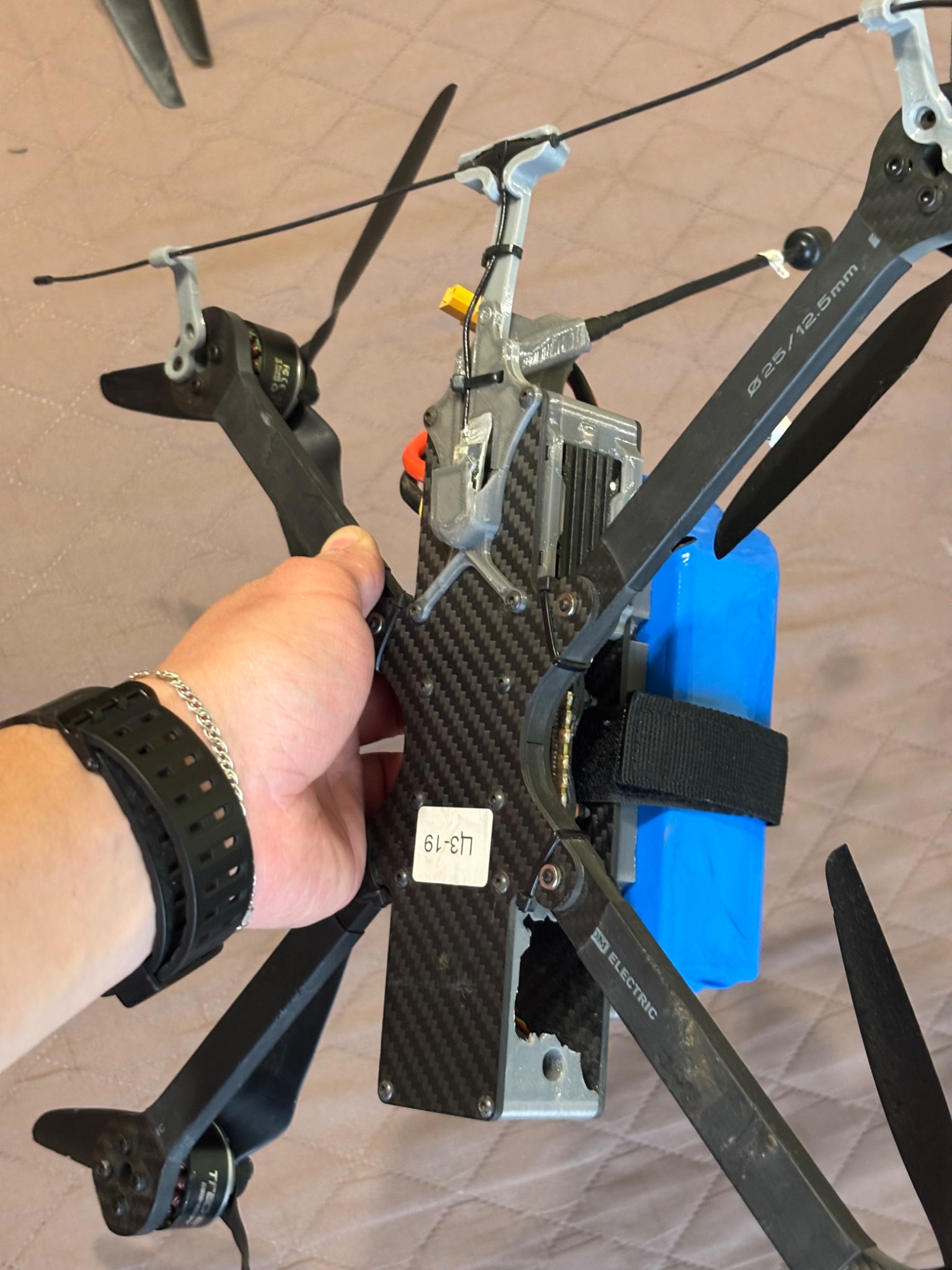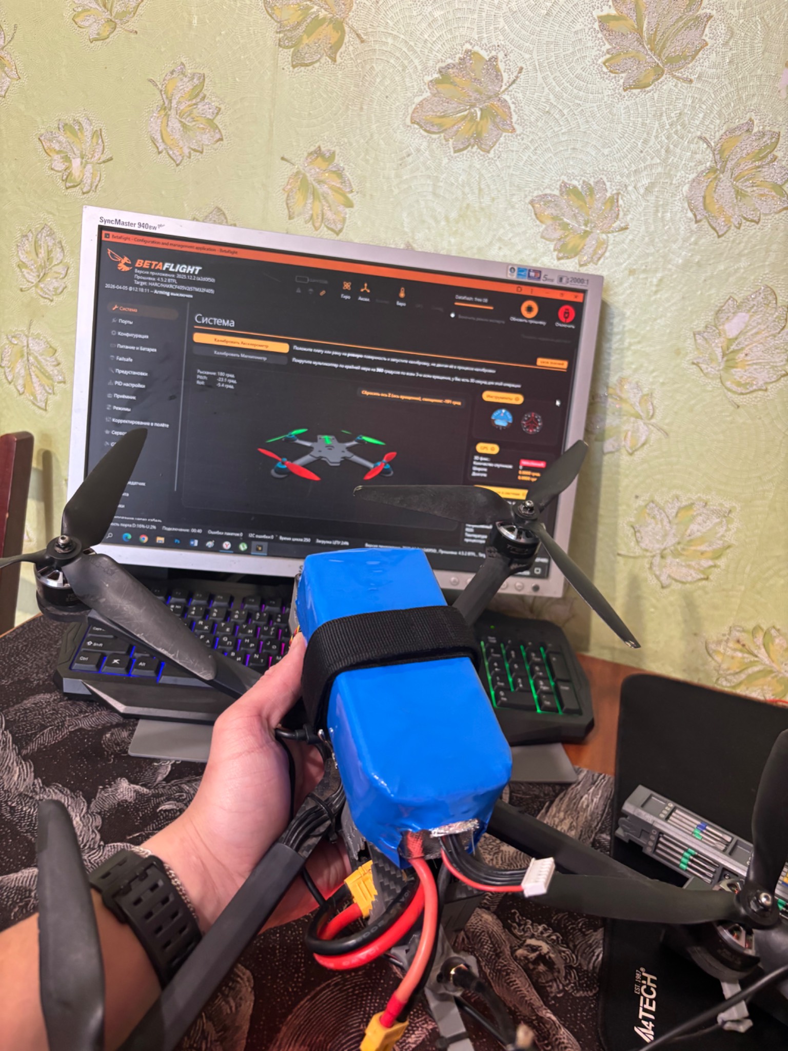 Вітаю трофейний FPV схожий на ВТ 40 але в карбоні, рама ціла без пошкоджень, двигуни всі крутяться, не горілі, пропи цілі, плата антени теж цілі, до бетафлай підкобчаєтся, пищіть та мигає, батка на вигляд без ушкоджень, перевірити ну аж чим, але телефон через перехідник заряджала, камера Caddx в цілому стан супер без проблем, на відновлення або в колекцію
