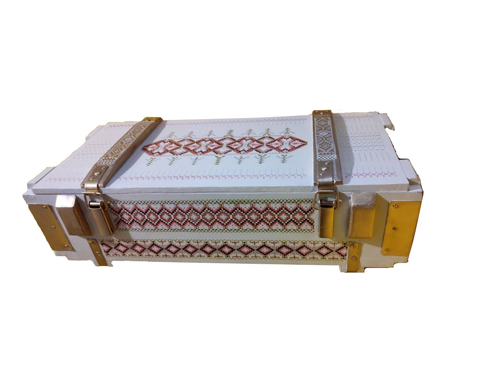 Український орнамент – це не просто прикраса. Це ціла філософія, система знаків, які несуть глибоке значення і становлять багату культурну традицію народу. Складна історія України залишила на її культурі незабутній слід. Орнаменти з'явилися в давнину та еволюціонували під впливом різних факторів, включаючи релігійні вірування, політичні зміни та економічний розвиток. Первинні зображення виходять за межі простої естетики, вони використовувалися як знаки, що передавали ідеї, легенди та міфи. Політичні та культурні впливи, як внутрішні, так і зовнішні, формували характер орнаментів. Це можна простежити у низці артефактів, починаючи з трипільської культури і закінчуючи сучасними музичними та мистецькими течіями. Орнамент став важливим елементом в одязі, домашньому декорі та ритуальних предметах, що підкреслювало його універсальність та значущість. З давніх-давен орнаменти використовувалися для прикраси текстилю, кераміки та інших предметів побуту. Важливо, що кожен регіон України має свої унікальні традиції та стилі. Саме такий стиль ми й обрали, прикрасивши ящик від протитанкових мін (ТМ), який нам передали наші Захисники з донецького напрямку. Варто зазначити, що продаж кожного лота нашої онлайн-виставки – пряма можливість допомогти пораненим військовослужбовцям на одну з найскладніших напрямків – запорізькому, бо всі виручені гроші наш фонд спрямовує саме на ці дії.