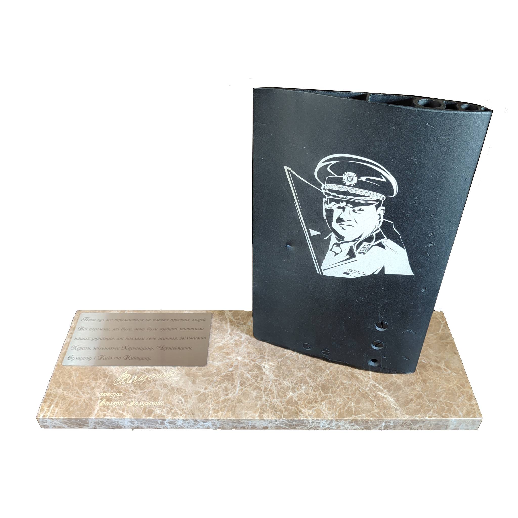 Унікальний лот – модуль блоку управління керованої авіаційної бомби. Керована авіаційна бомба є високотехнологічною зброєю, призначеною для точкового ураження нерухомих і рухливих цілей з руйнуваннями на навколишній місцевості. Сучасні моделі керованих бомб оснащені високоточним навігаційним обладнанням і системами цілевказівки, що дозволяє вражати цілі з неймовірною точністю. Створення керованих авіаційних бомб призвело до ретроактивного перейменування старих авіаційних бомб на некеровані або «тупі» бомби. Керовані авіаційні бомби під час повномасштабного російського вторгнення застосовували обидві сторони. Зокрема, Україна отримала від партнерів та успішно застосовувала комплекти JDAM-ER. Росія застосовувала модулі планування і корекції з авіаційними бомбами ФАБ-500М62 та комплекси «Грім». Але на відміну від наших військовослужбовців, які є єдиним буфером між мирним населенням та орками, захищаючи цілісність України, росія нещадно знижує лінію прикордоння та прифронтову лінію, завдаючи неймовірних пошкоджень та забираючи людські життя. На експозиції на гранітній підставці закріплено модуль блоку управління КАБа, на якому вигравіровано за допомогою лазера портрет генерала Валерія Залужного. На самій підставці процитовано слова генерала, а також розміщено його електронний підпис. Цей лот унікальний і єдиний у своєму роді, завдяки чому він займе гідне місце у вашій колекції.