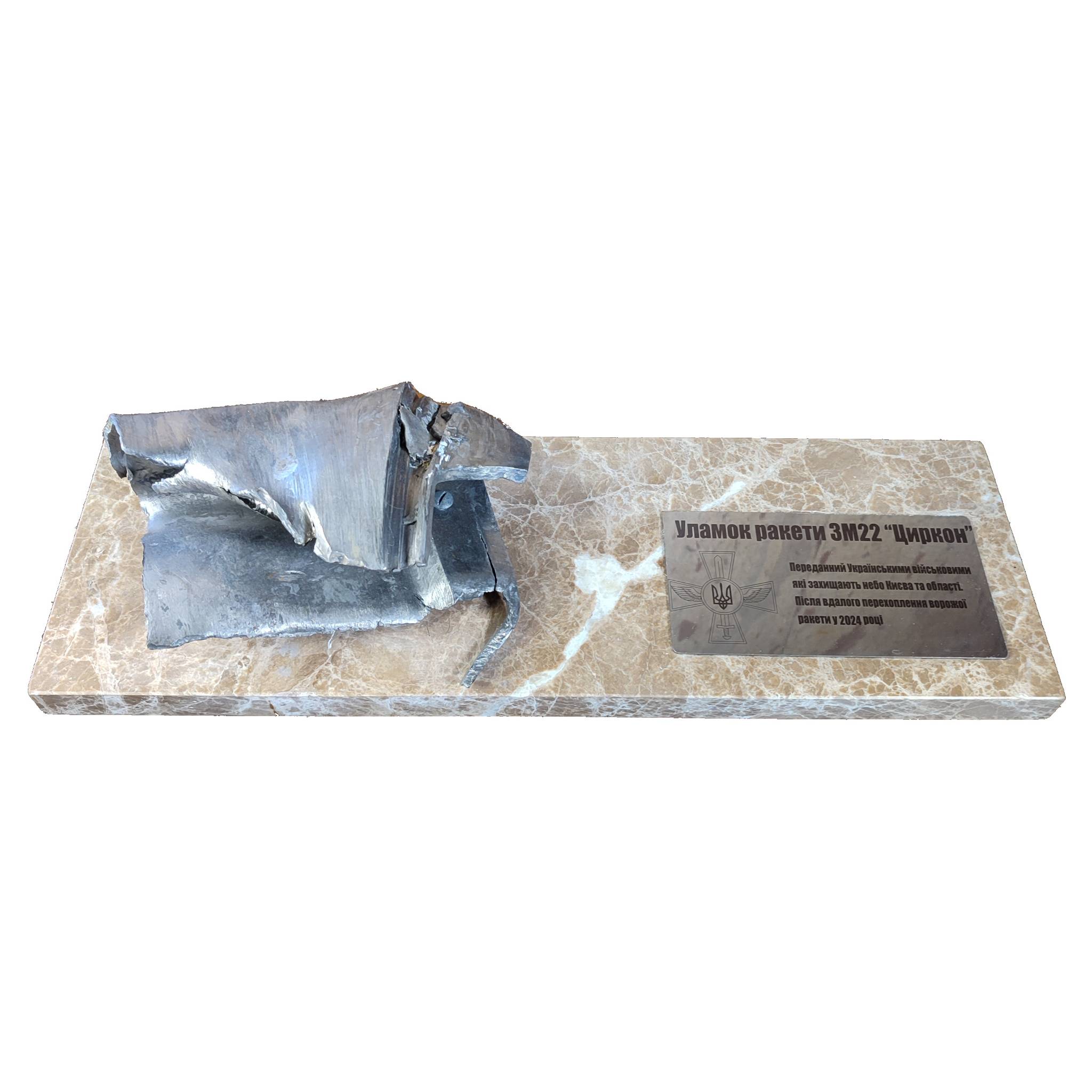 Унікальний лот – уламок збитої над Києвом ракети ЗМ22 Циркон. Ця ракета є гіперзвуковою крилатою ракетою. Циркон задуманий як багатофункціональний засіб для ураження різних цілей. Циркон відрізняється високою швидкістю, яка може досягати 9 махів. Це робить її однією з найшвидших ракет, які існують на сьогоднішній день. Відомо, що Циркон може бути запущений з різних платформ: підводних човнів, надводних кораблів і навіть з берега. Вперше про можливе застосування Циркону стало відомо під час російського нападу на Україну. 29 грудня 2023 року під час чергового масованого ракетного удару вперше було застосовано ракету «Циркон», фрагменти ракети було знайдено у Запоріжжі. 7 лютого 2024 року після ракетного обстрілу у Києві було виявлено фрагменти з маркуванням 3М22. Ракетою було пошкоджено пішохідну доріжку та високовольтний кабель. На місці детонації залишилась велика вирва. 12 лютого 2024 року Київський науково-дослідний інститут судових експертиз підтвердив бойове застосування ракети «Циркон» по місту Київ. 25 березня 2024 року над Києвом українською ППО було збито дві ракети «Циркон», уламки яких пошкодили будівлю у Печерському районі і зруйнували частину будівлі Академії декоративно-прикладного мистецтва і дизайну імені М. Бойчука, внаслідок чого було поранено викладачку-методистку академії. За даними телеграм-каналу Monitor, ракети подолали шлях у 580 кілометрів до Києва за три хвилини.
