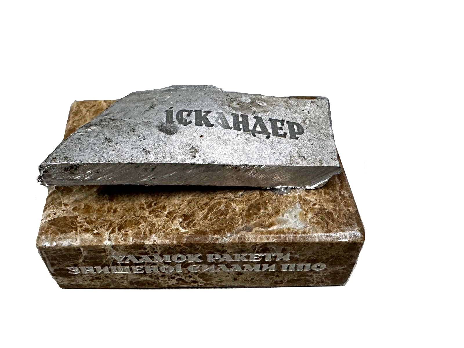 Перед вами – уламок ракети Іскандер, закріплений на мармуровій підставці, яку знищили наші сили ППО. Іскандер – це російська тактична ракетна система, розроблена для знищення різних цілей на суші. Вона була створена наприкінці 1990-х років і з тих пір експлуатується в російській армії. Вона може змінювати траєкторію польоту і використовувати різні тактики, щоб досягти цілі. Крім того, Іскандер має високу швидкість і може вражати цілі протягом декількох хвилин після запуску. Незважаючи на свою міць та ефективність, Іскандер є відносно компактною та мобільною системою. Вона може бути розгорнута та готова до бою всього за кілька хвилин, що робить її небезпечним засобом для оперативного застосування. Нагадуємо, що всі кошти від продажу наших лотів фонд «Україна це ти» спрямовує на підтримку поранених військових на запорізькому напрямку.