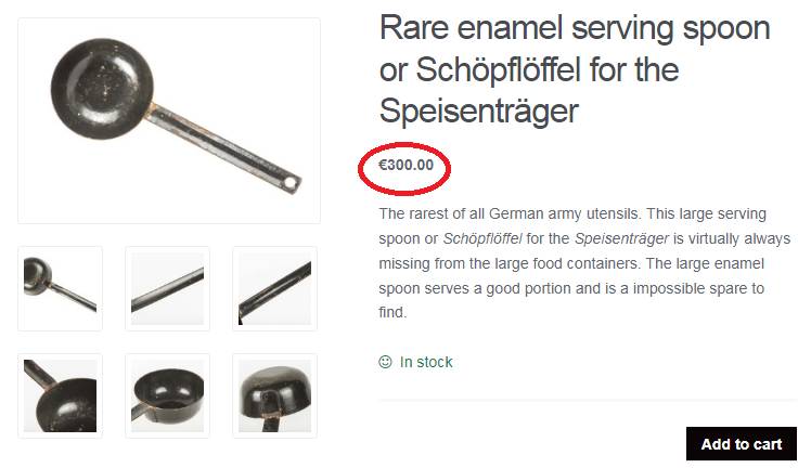 Найрідкісніший з усього німецького армійського посуду. Ця велика ложка для сервірування або Schöpflöffel для Speisenträger практично завжди відсутня у великих контейнерах для їжі. Велика емальована ложка служить гарною порцією