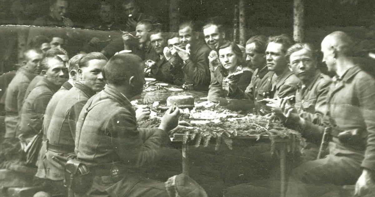Воїни УПА відзначають Великдень за святковим столом.
