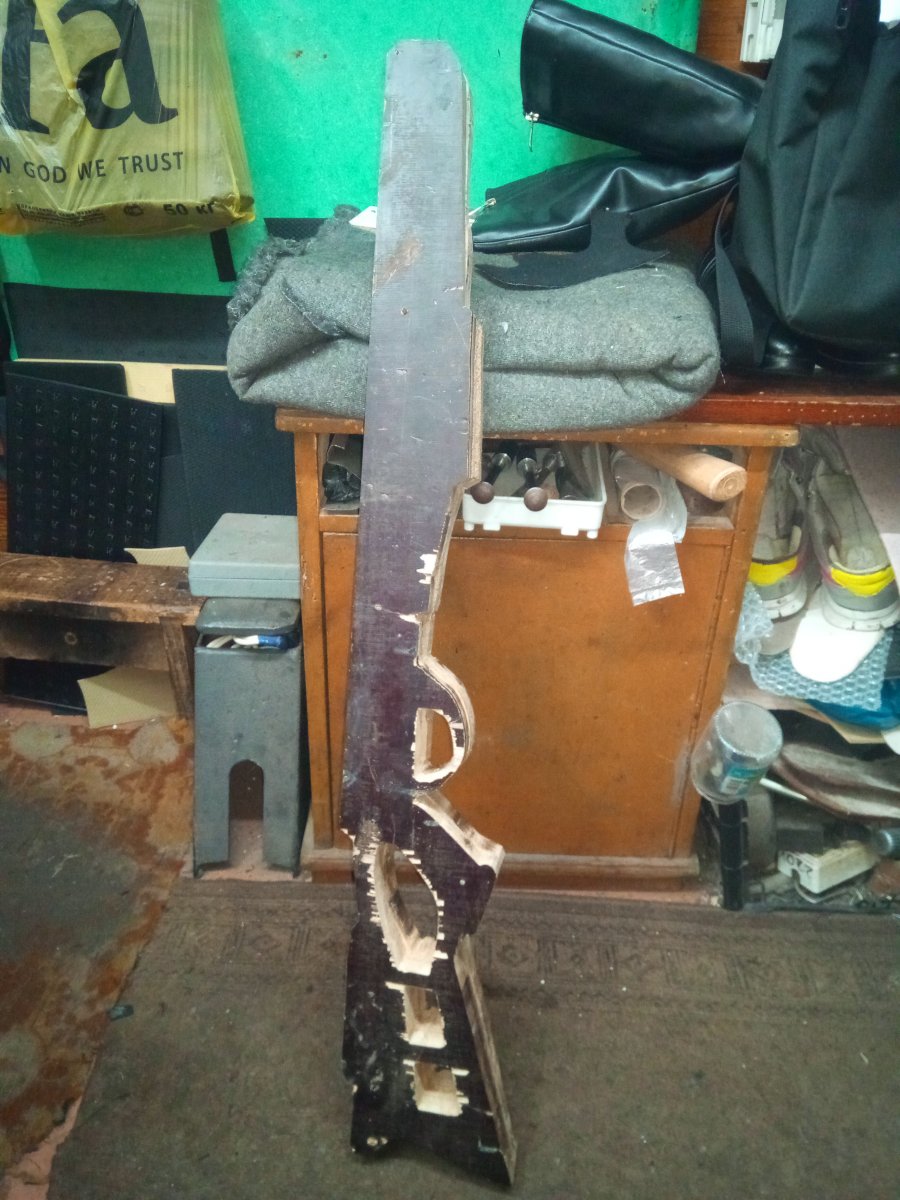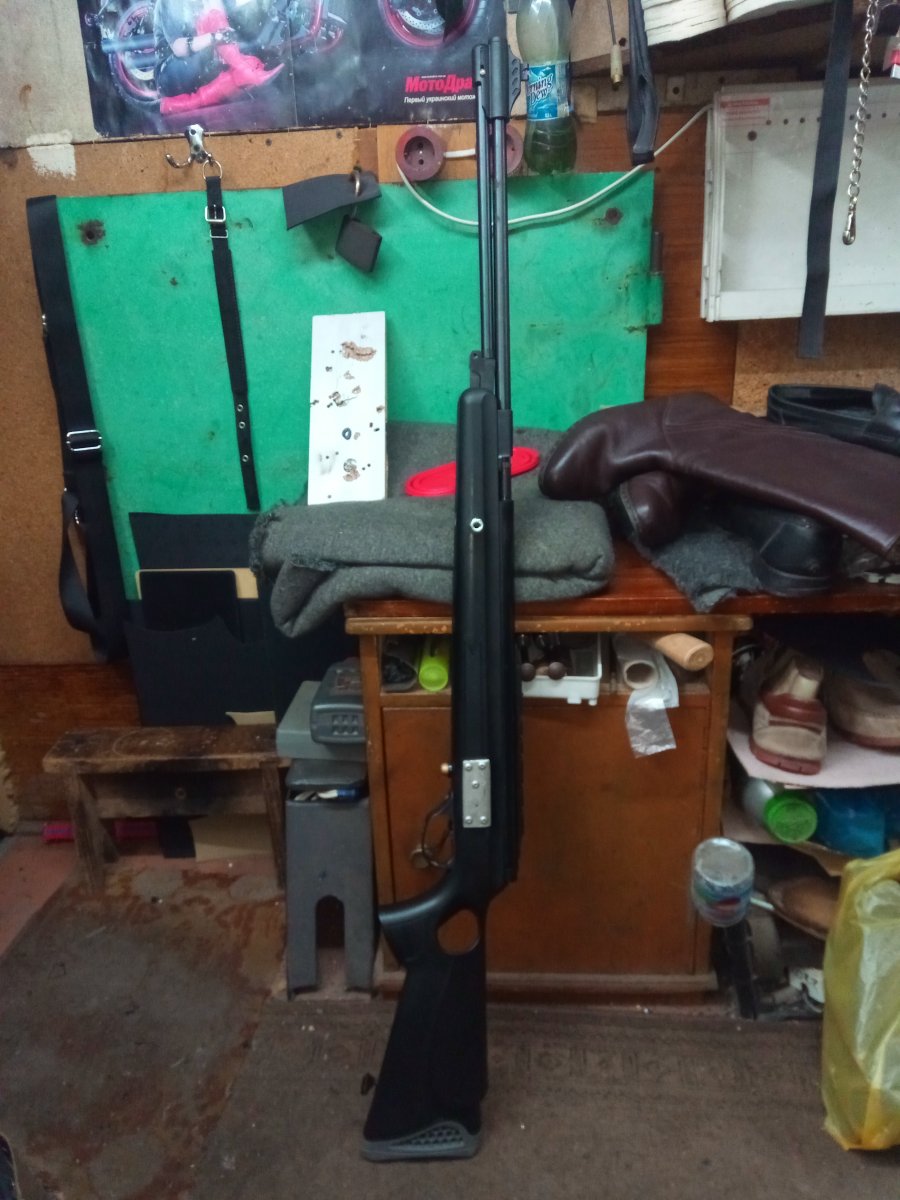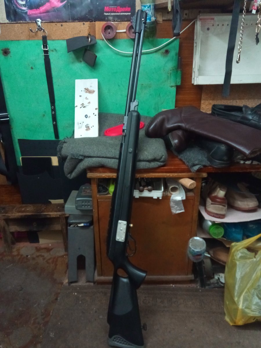 Винтовка досталась по обмену с перебитым прикладом и нюансами по железу ( приклад восстановлен отстрел прошол успешно. есть заготовка приклада из фанеры осталось придать форму ) поменян перепуск , манжета с компрессора убраны загусеници установлен направляющая пружины и амортизатор ( резиновая шайба 0,8мм ) выстрел тихий звона нет спуск плавный .