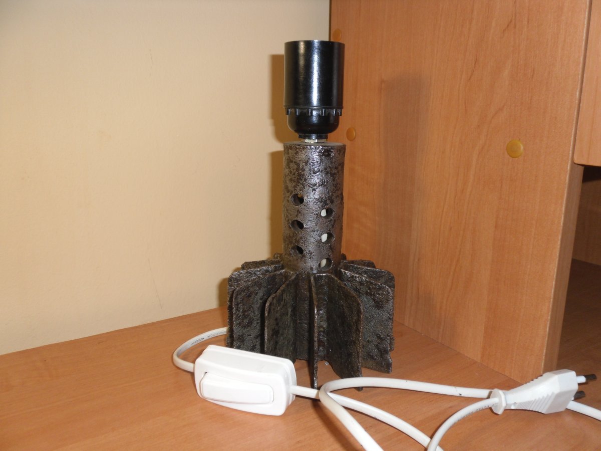 Хвост от 120мм мины времен ВОВ, переделанный под настольную лампу, если вкрутить лампочку-работает. Нужно что-то придумать с абажуром.