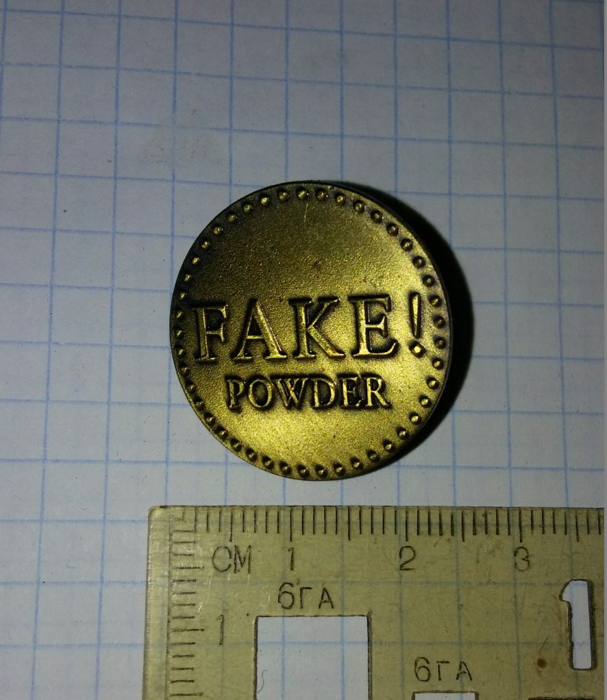 Значок "Fake! Powder", метал з порошковим покриттям під бронзу.
