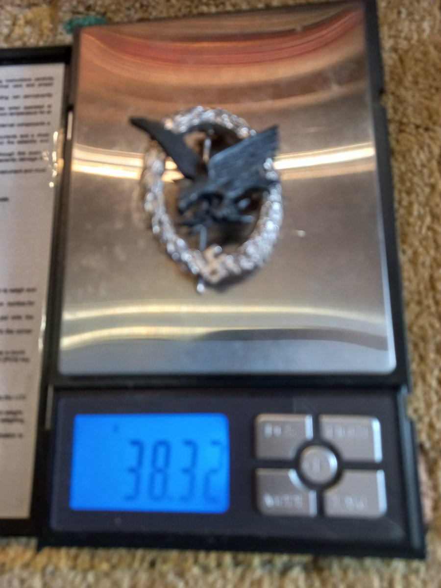 Немецкий знак Бортрадист с молниями - изготовлен полностью из серебра 900 пробы.Знак собран из двух частей на двух заклепках купольных.Петля игла и крючок изготовлены отдельно и припаяны на серебро надежно.Производитель фирма Ассман - клеймо А.Знак изготовлен для ветеранов под заказ в период с 1955 - 1990гг.Знак массивный с детальной проработкой .Вес и размеры совпадают.![]()