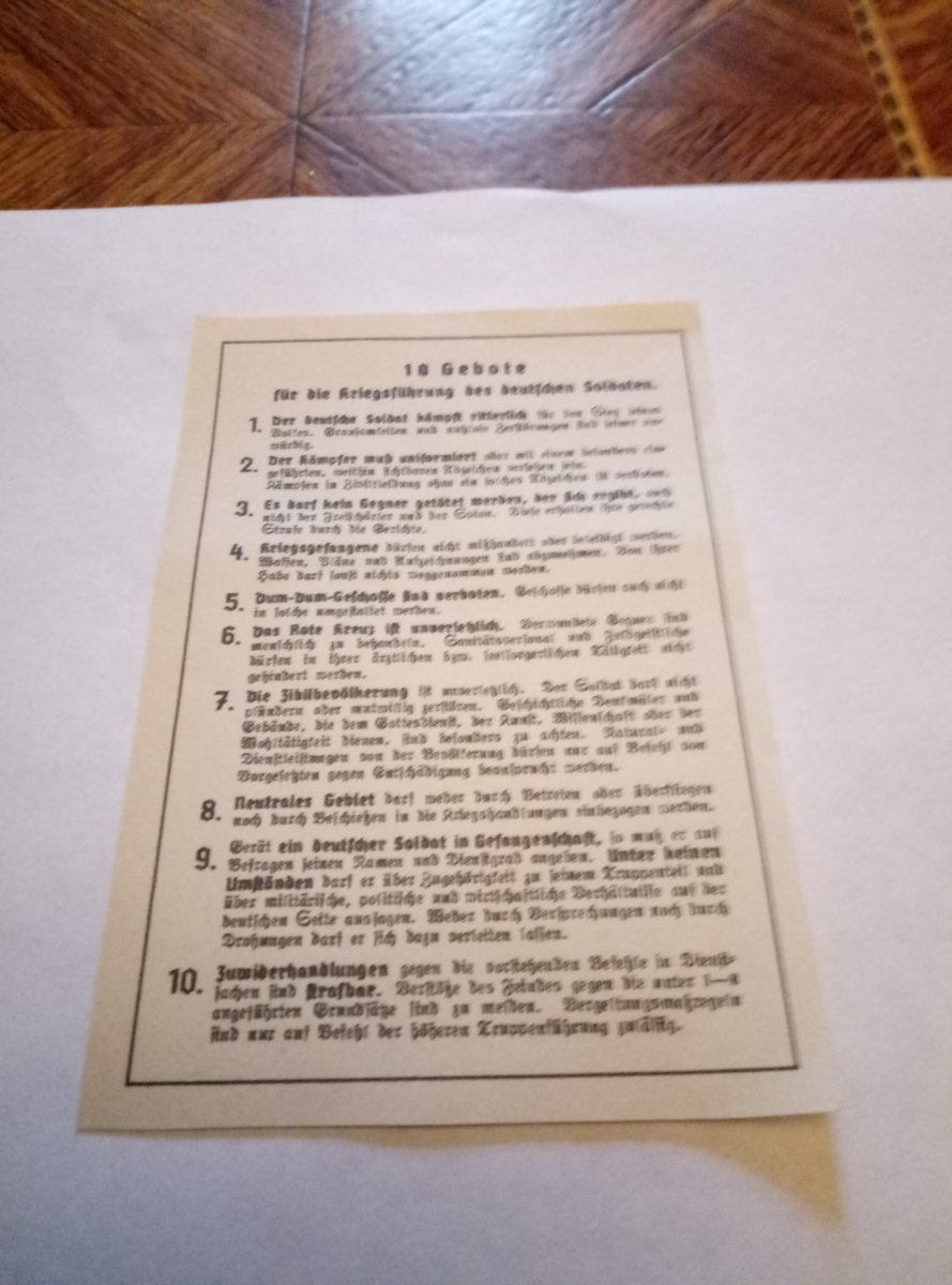 Точная копия раннего зольдбуха (образца 1939-го года). 24 страницы + 4 страницы вклеек (выдача оружия) + вклейка на 7-ой странице (выдача обмундирования) которые делались в 1940-м году. Плюс листик с десятью заповедями немецкого солдата (вкладывался в задний кармашек обложки или приклеивался на вторую страницу обложки)