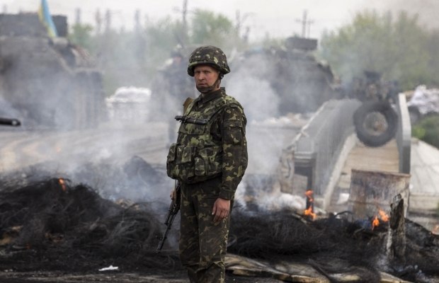 Украинский десантник на уничтоженном блок-посту боевиков под Славянском. Апрель 2014г.