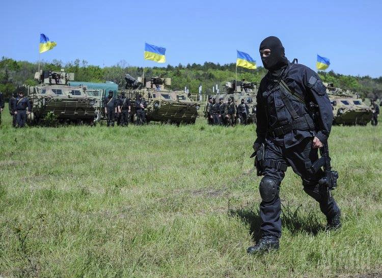 Боец одного из спецподразделений на фоне БТР-4Е в полевом лагере украинских войск на Донбассе. Май 2014г.