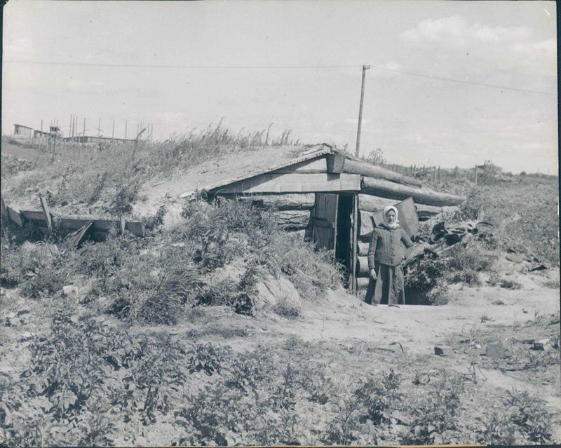 Женщина у землянки, вторая половина 1940–х, Минск Фото Джона Строма из ACME. Подпись к фото гласит: "Когда–то на месте этой землянки, сооруженной посреди разрушенного войной Минска, стояли жилые дома. Сейчас в Минске огромная проблема с жильем. Сегодня картофельные делянки и землянки покрыли разрушенное пространство. Крайняя нехватка поставок техники затрудняет работы по реконструкции Минска." Сразу же после освобождения, уже с 1944 года, все республики СССР начали оказывать серьёзную помощь разрушенной Беларуси. В свою очередь, международный Красный Крест и американские благотворительные организации отправляли эшелоны с обувью, одеждой и другими вещами, необходимыми обездоленным людям. Иногда помощь распределялась достаточно своеобразно, о чём можно судить по некоторым документам. В 1944 году представитель ЦК ВКП (б) в Минске Филимонов докладывал секретарю ЦК ВКП (б) Георгию Маленкову: "В Белорусское общество "Красный крест" и "Красный полумесяц" за последнее время поступает большое количество промышленных товаров, вещей–подарков из заграницы. ... Вместо принятия мер по улучшению дела на месте незаконно стали раздавать вещи прямо с центральной базы отдельным лицам без определения их степени нуждаемости, из чувства благотворительности. Подобная практика приняла настолько широкие размеры, что на центральной базе "Красный крест" незаконно был организован специальный склад, куда отбирались наиболее ценные вещи для раздачи их по запискам и устным указаниям. Записки писали по своему почину почти все руководящие работники республики (в количестве 11 человек), распоряжались вещами и второстепенные работники....Так, в ходе проверки нами было задержано исполнением письмо управделами Президиума Верховного Совета БССР т. Стронгина следующего содержания: "Прошу отпустить из базы Красного креста для меня и помощника Председателя Президиума Верховного Совета БССР т. Вольфсона..." — и далее идет перечисление 60 вещей, среди них 6 пальто, костюмы, обувь, головные уборы, пижамы и прочее".