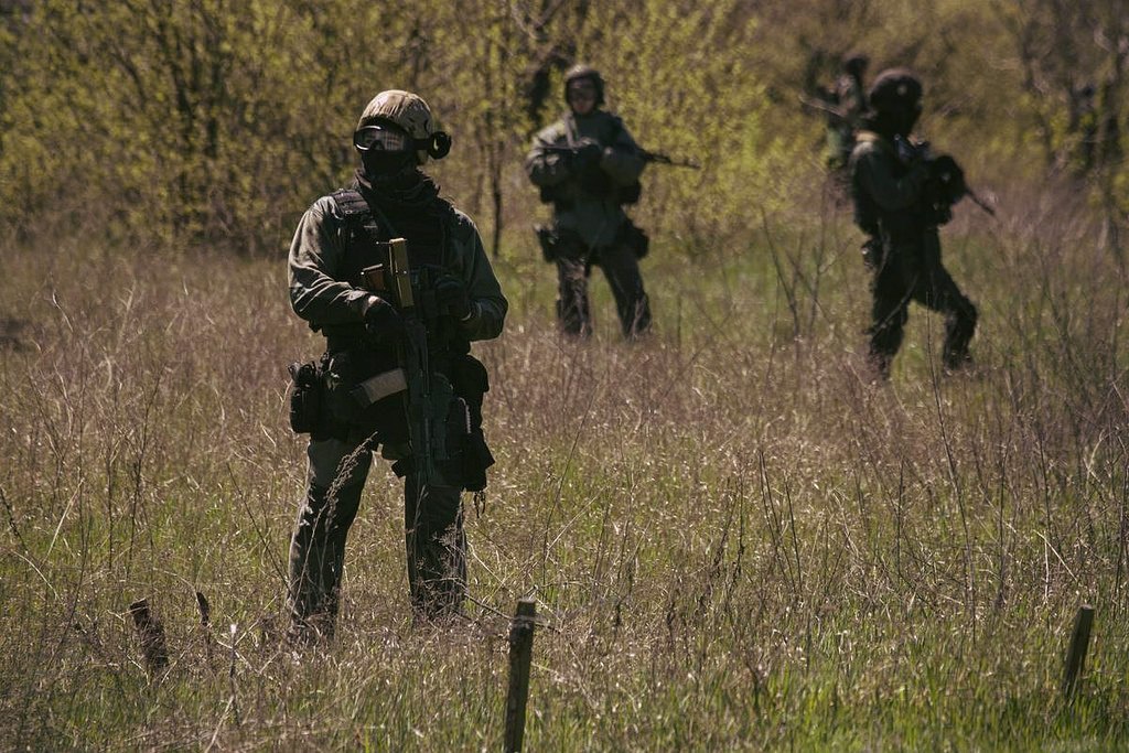 Бойцы одного из украинских спецподразделений в зоне боевых действий. Июнь 2014г.