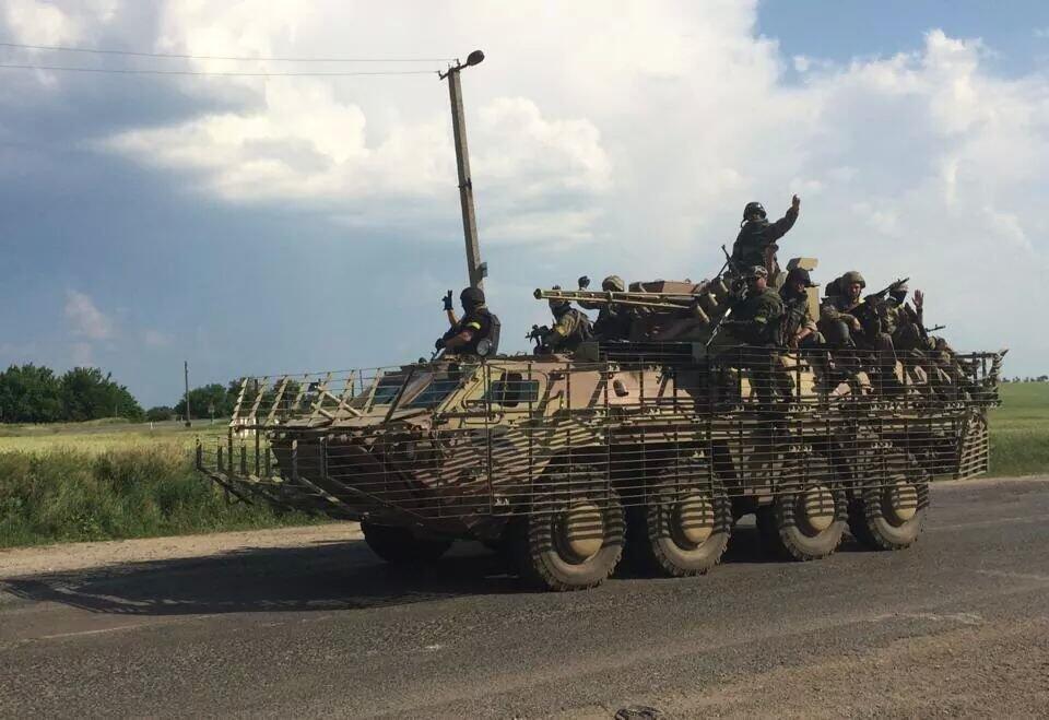 Украинские бойцы на броне БТР-4Е в зоне боевых действий. Июнь 2014г.