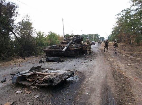 Бойцы добровольческого батальона "Донбасс" осматривают уничтоженный российский танк Т-72. Август 2014г.