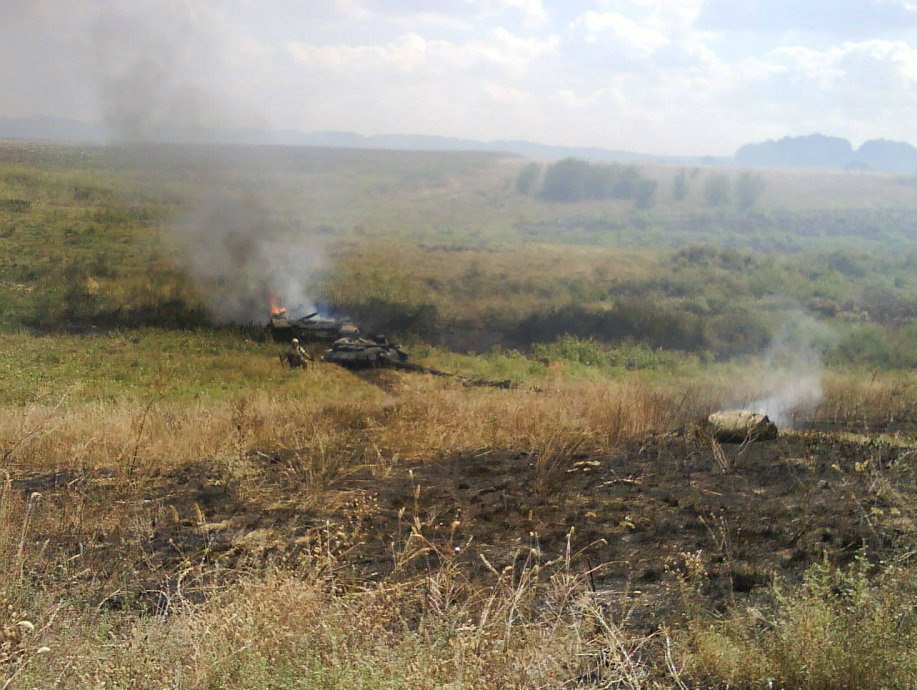 Уничтоженный российский танк Т-72БЗ под Иловайском. Во время прорыва из Иловайского "котла", бойцы добровольческого батальона "Донбасс" с позывными "Усач", "Брест" и "Бугор" уничтожили два танка Т-72БЗ и два БМД-2 с экипажами оккупантов.