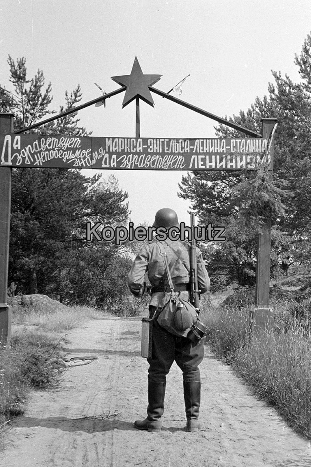 Ворота в советский рай.Finnischer Soldat am Eingang einer russischen Kolchose