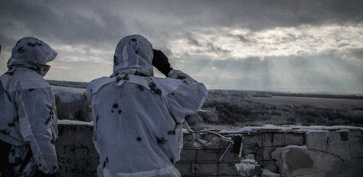 Украинские бойцы на крыше одного из разрушенных зданий в освобожденном Новолуганске. Декабрь 2016г.