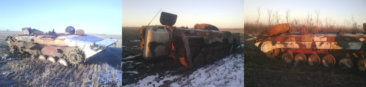Уничтоженная российская БМП-1 в районе ВОП "Вампир". Во время боев в этом районе украинскими бойцами были уничтожены две БМП-1 и один танк Т-64БВ. Также один танк Т-64БВ был захвачен в качестве трофея.
