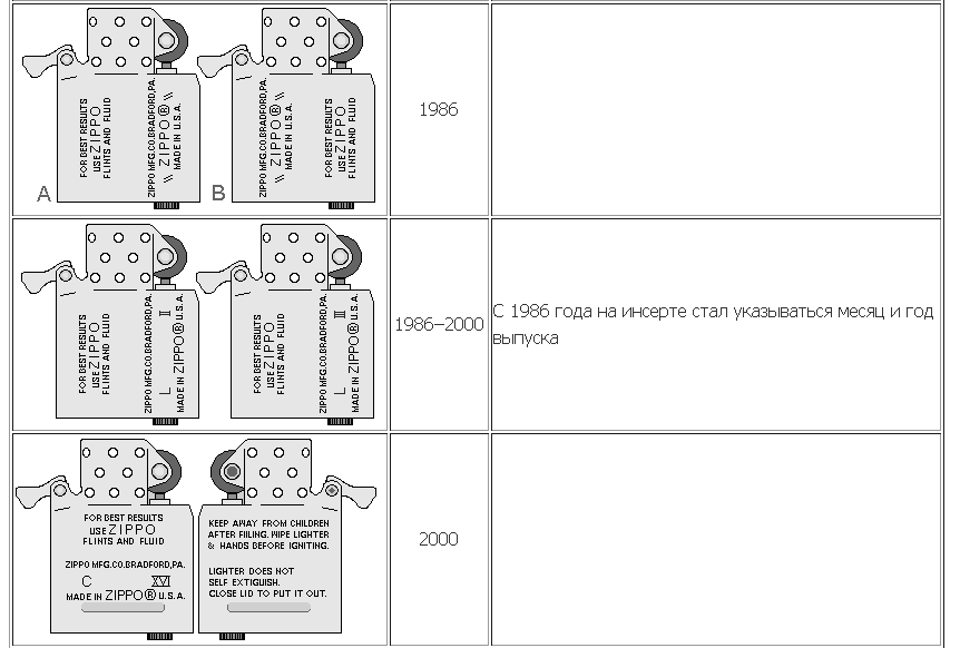 таблица опознания зажигалок "Зиппо"