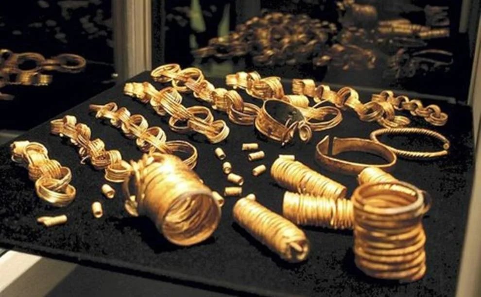 Обнаружен рабочими при прокладке трубопровода Северный поток в Германии.Все предметы из этого клада были отлиты из 90% золотого сплава им оказалось больше 3тыс.лет.