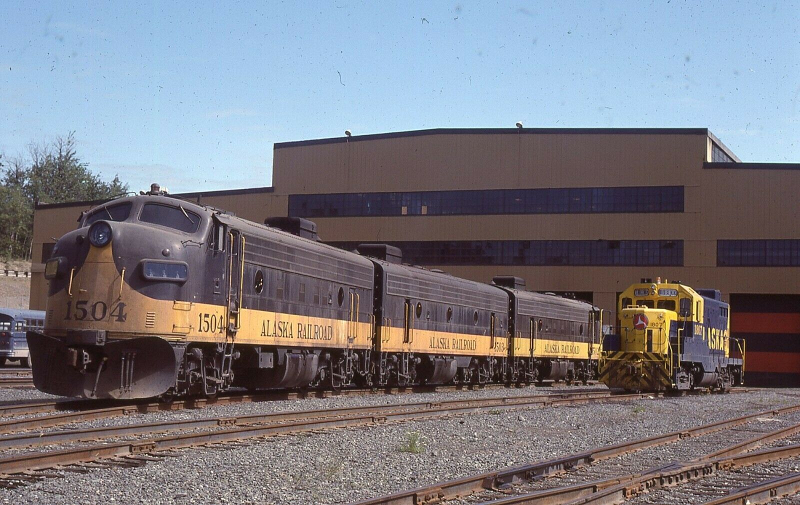Alaska RR EMD F&A-B-A number 1504-1503-1512 and 1807 outside engine-house at Anchorage, AK. Taken - 07/10/1978.