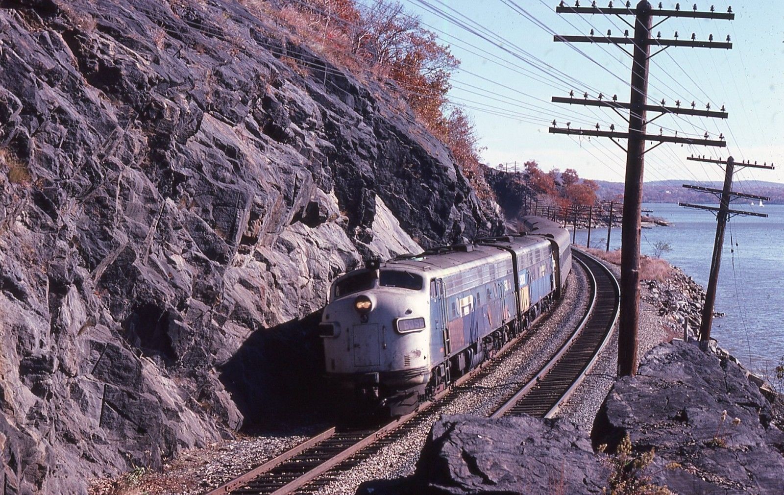 Conrail EMD FL9 number 5056 with another leads train towards Bear Mountain Tunnel just north of Peekskill, NY. Taken - 11/1978.