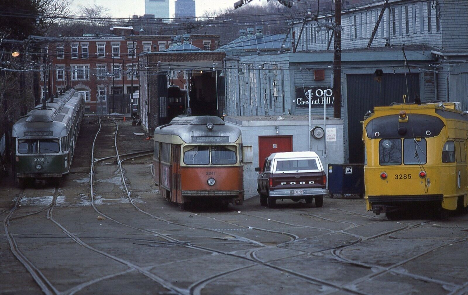 MBTA PCC number 3241 and number 3089 + an d general view of Chestnut Hill car-house at Boston, MA. Processed - 04/1978.