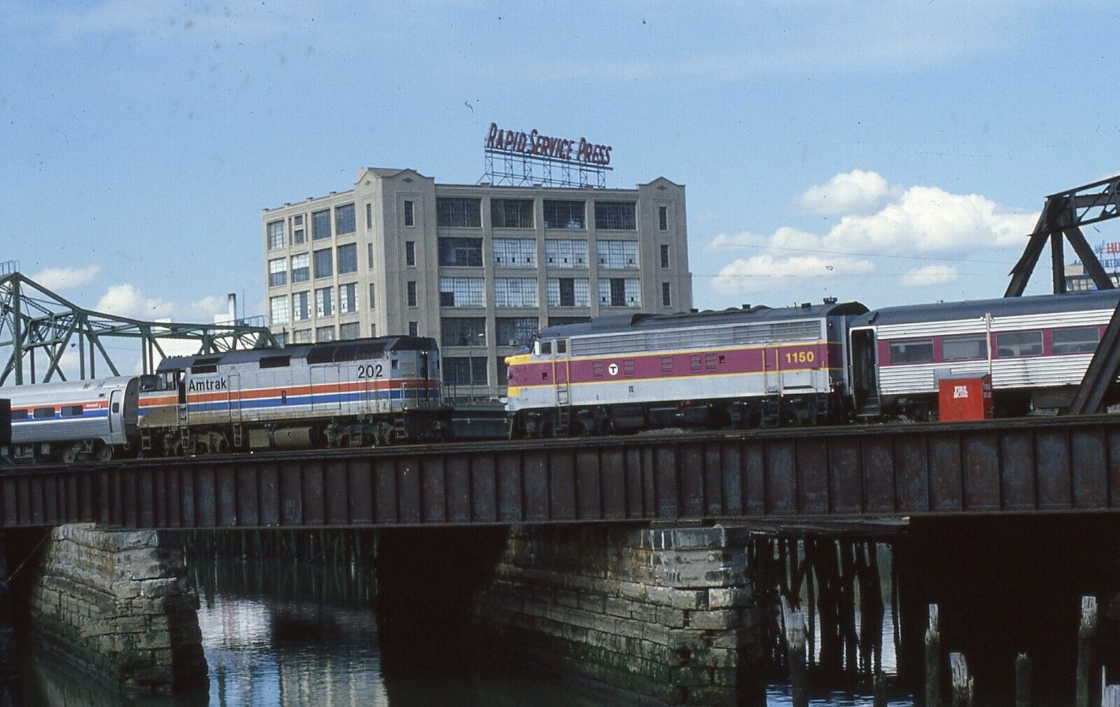 Amtrak EMD F40PH number 202 meets MBTA EMD FP10 number 1150 on Fort Point Channel Draw at Boston, MA. Taken - 04/19/1979.