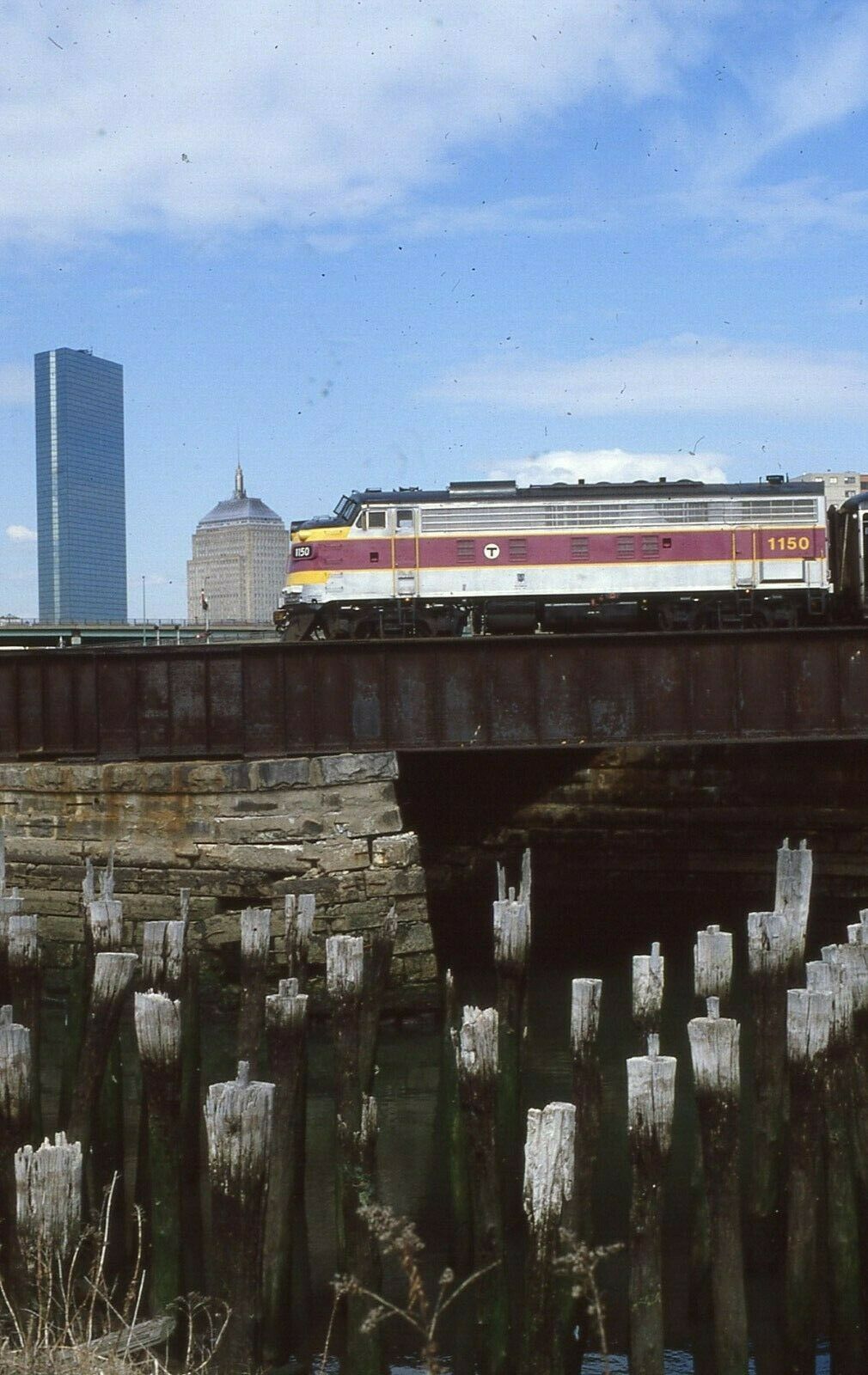 MBTA EMD FP10 number 1150 crosses Fort Point Channel bridge at Boston, MA. Taken - 04/19/1979.