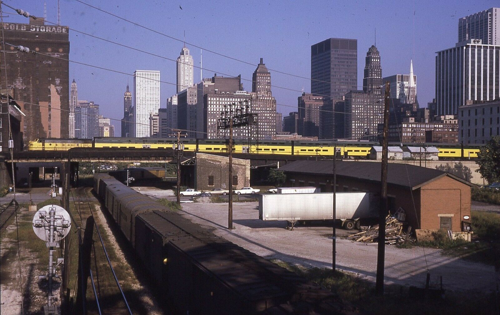 Chicago & North Western EMD F7 leads commuter train away from Northwestern Station at Chicago, IL. Taken - 08/1970.