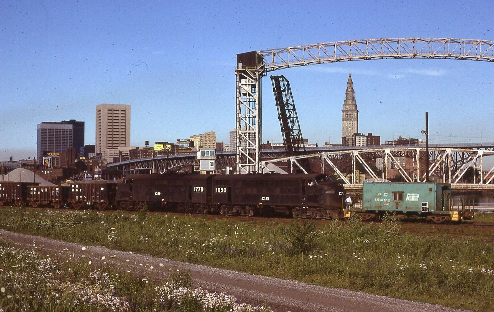 Conrail EMD F7 number 1650-1779 with PC Transfer Caboose 18492 along the waterfront at Cleveland, OH. Taken - 07/19/1978.