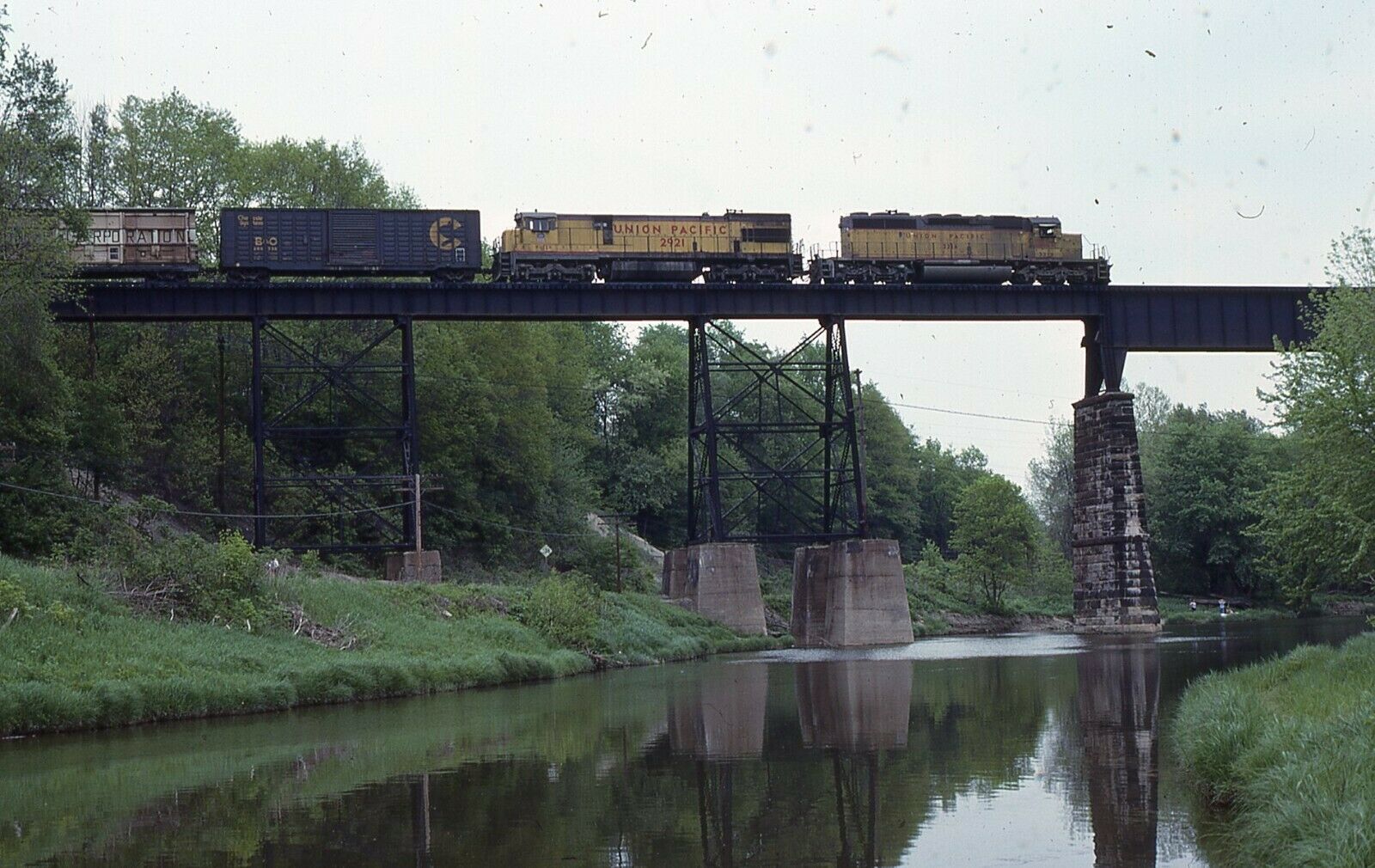 Union Pacific EMD number 3216 with GE number 2921 crossing trestle at Conneaut, OH. Taken - 05/20/1979.