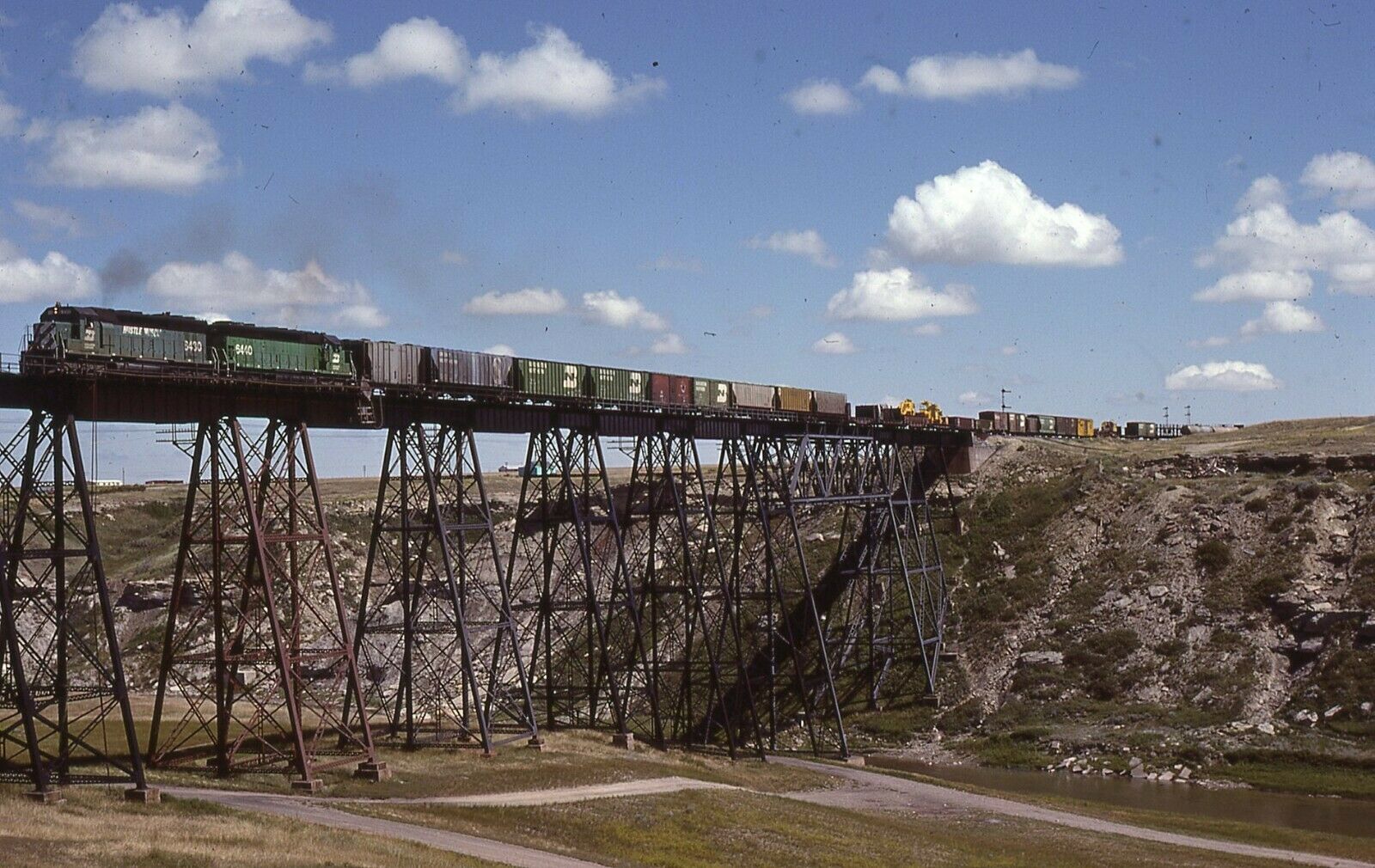 Burlington Northern EMD Duo number 6440-6430 crossing high trestle at Cut bank, MT Taken - 07/28/1978.