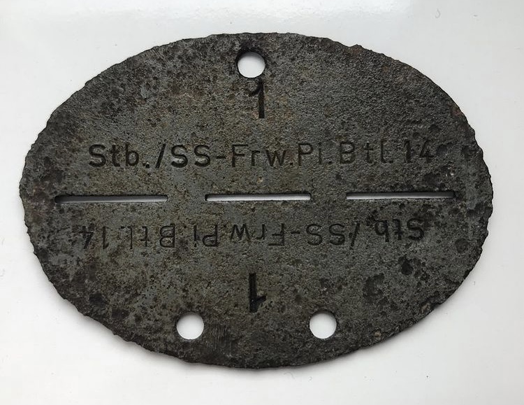 Жетон бійця штабу 14 добровольчого саперного батальйону військ СС. Даний підрозділ структурно входив у склад 14 добровольчої гренадерської дивізії військ СС «Галичина». Цікаво те, що особистий номер бійця була цифра «1».